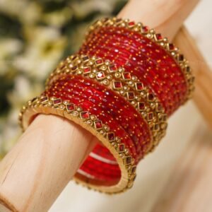 1 dozen raindrop glass bangles in crimson red. For 2 Hands – 4 Side kadas – Antique gold finish with square kundan stonework.