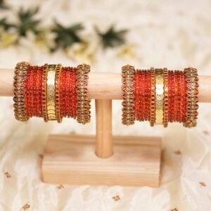 Material: Premium Glass & Thread with Kasu. Sizes Available: 2.2, 2.4, 2.6 & 2.8. Set Includes: For 1 Hand – 2 broad kada Side Bangles – Handmade floral design kada bangles. 1 Centre Bangle – Handmade kasu bangle and 2 thin side bangles and 1 dozen glass bangles. For 2 Hands – 4 broad kada Side Bangles – Handmade floral design kada bangles. 2 Centre Bangle – Handmade kasu bangle and 4 thin side bangles and 2 dozen glass bangles. Customization Available on Request