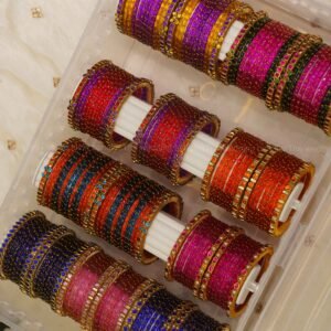 Collection Highlights: *Wide range of colors – Sapphire Blue, Ruby Pink, Maroon, Orange, Gold & Black accents. *Kadas designed with kundan in square, floral, and teardrop patterns. *Premium glass bangles with golden dotted detailing for a rich festive look.