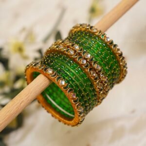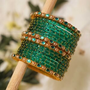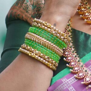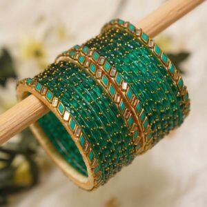 1 dozen glass bangles – Premium emerald green glass with golden bead accents. For 2 Hands – 4 Side kadas – Antique gold finish with diamond-cut kundan stones (green, ruby & white).