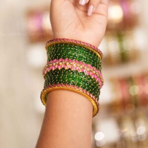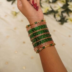 2 dozen glass bangles – Premium single stone glass bangles in emerald green & peach with dotted detailing. For 2 Hands – 4 Side kadas – Antique emerald prism sleek bangles with kundan accents. 4 dozen glass bangles – Premium single stone glass bangles in emerald green & peach with dotted detailing.