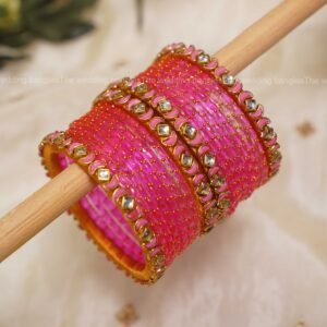 2 dozen glass bangles – Premium pink glass with golden bead accents. Customization Available on Request