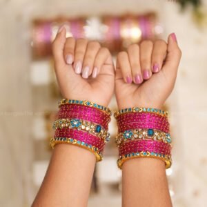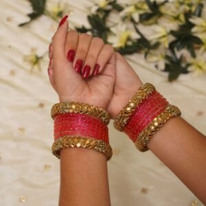 1 dozen glass bangles – Premium pink glass with golden bead accents. For 2 Hands – 4 Side kadas – Antique gold finish with crescent pink enamel & kundan detailing.
