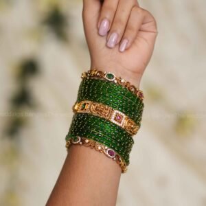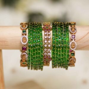 Material: Premium Glass & Thread. Sizes Available: 2.2, 2.4, 2.6 & 2.8. Set Includes: For 1 Hand – 2 handmade bangles and 1 dozen crystal green glass bangles. For 2 Hands –