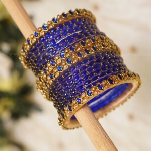 1 dozen raindrop glass bangles in royal blue. For 2 Hands – 4 Side kadas – Antique gold finish with star kundan motifs & stonework.