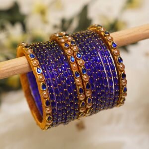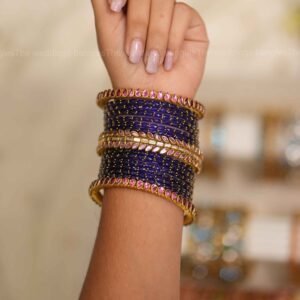 1 dozen glass bangles – Premium blue raindrop bangles. For 2 Hands – 4 Side kadas –handmade thread bangles with teardrop blue kundan stones & pearl accents.