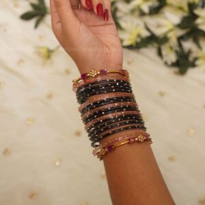 1 dozen glass bangles – Premium glossy black & peach single stone bangles. For 2 Hands – 4 Side kadas – Ruby Prism Sleek bangles with ruby square stones & crystals. 2 dozen glass bangles – Premium glossy black & peach single stone bangles.