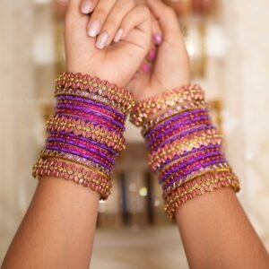 1 dozen raindrop glass bangles in royal orchid purple. For 2 Hands – 4 Side kadas – Antique gold finish with crescent kundan stonework in pink & purple.