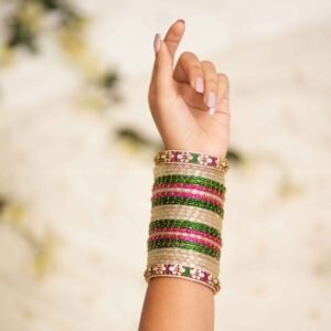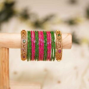 3 dozen glass bangles – Raindrop bangles in ivory, green & ruby pink. For 2 Hands – 4 Side kadas – CZ stone designer bangles with ruby & emerald accents. 6 dozen glass bangles – Raindrop bangles in ivory, green & ruby pink.