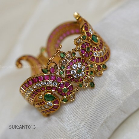 Elevate your festive look with this stunning adjustable kada bangle featuring an intricate twin peacock design. Set in a gold-toned base, the kada is adorned with rich ruby pink, emerald green, and sparkling white CZ stones, reflecting timeless elegance and vibrant charm. The flexible, adjustable fit ensures comfort without compromising on grandeur, making it a perfect choice for brides and wedding guests alike.