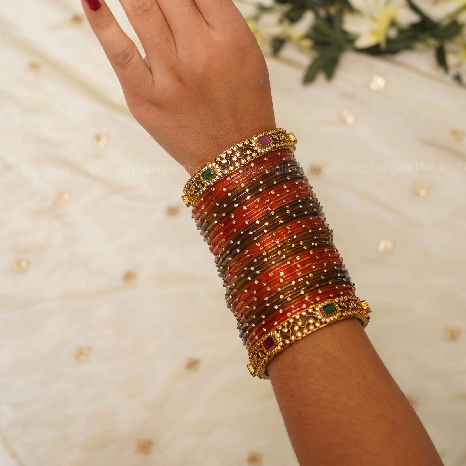 Classic and graceful, the Antique Gem Glow Bangle Set brings together rich tradition with timeless beauty. The set features antique gold-finish kadas on the sides, adorned with oval ruby and emerald gem accents for a regal touch. At the center, glossy single stone glass bangles in shades of burnt orange and deep brown with dotted detailing add a vibrant yet sophisticated look.