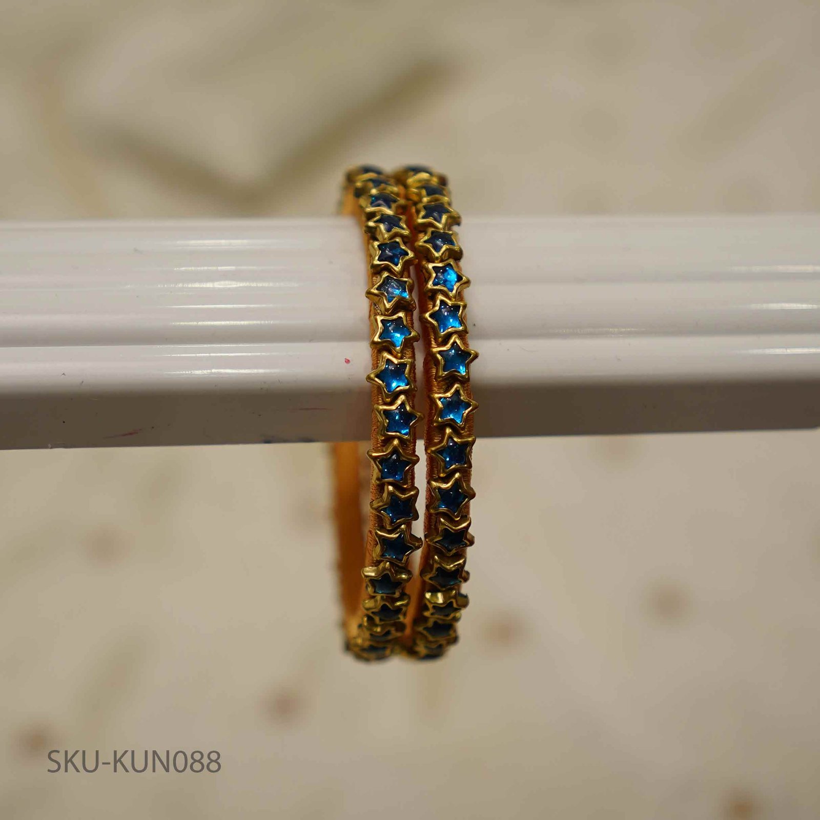 Elegant handmade Kundan bangles featuring intricate star motifs filled with striking blue enamel work. Each piece is beautifully designed with fine detailing and a glossy golden finish, making it a timeless addition to your traditional jewelry collection. Perfect for festive wear, weddings, and special occasions, these bangles bring a vibrant yet graceful charm to your ensemble.