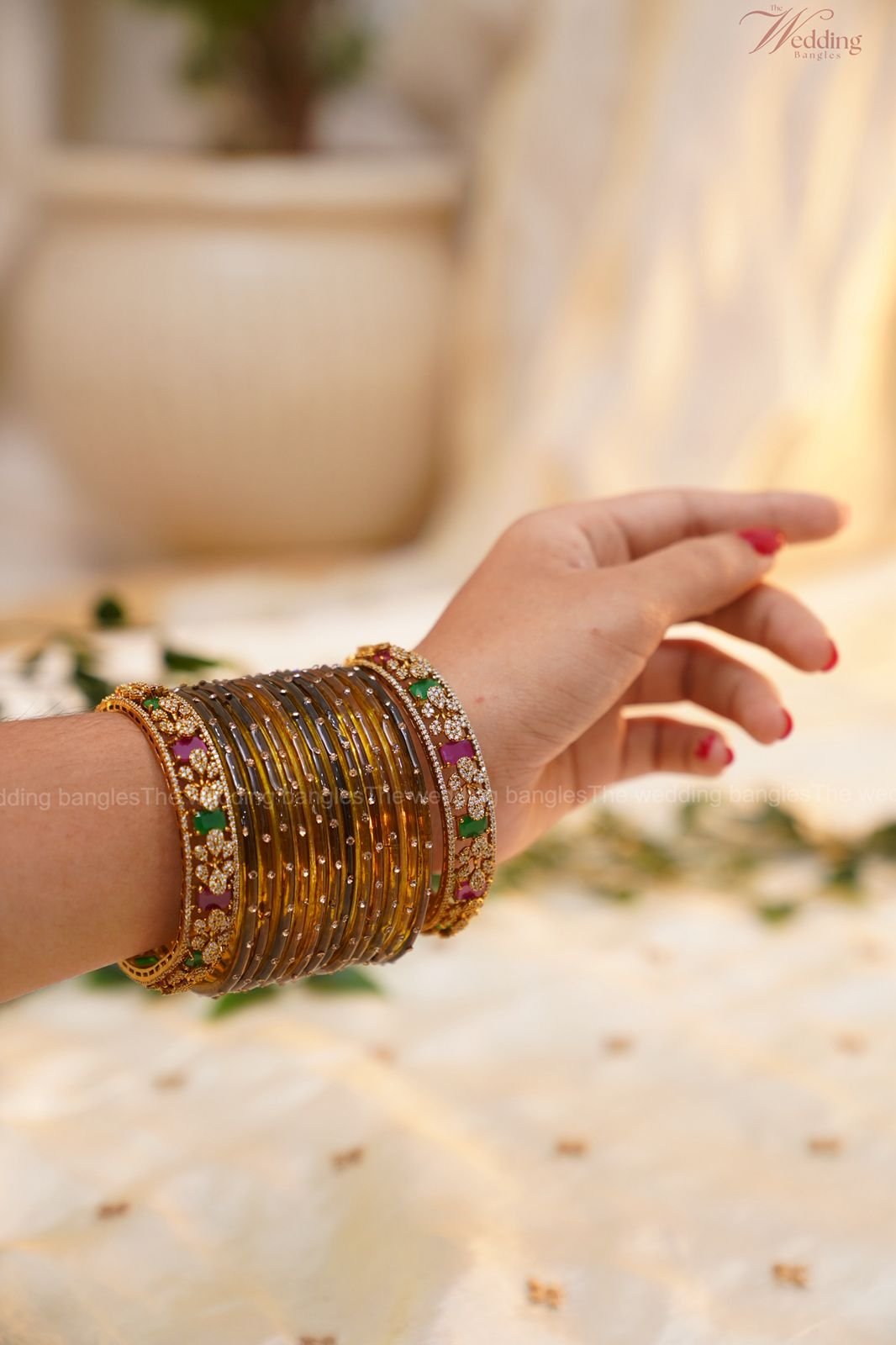Elegant and timeless, the Emerald Glow CZ Bangle Set pairs tradition with a touch of sparkle. The side bangles feature CZ stone designer bangles adorned with ruby and emerald accents, while the middle bangles are mehendi green single stone glass bangles, adding a rich and regal contrast. Perfect for festive occasions, weddings, and traditional celebrations.