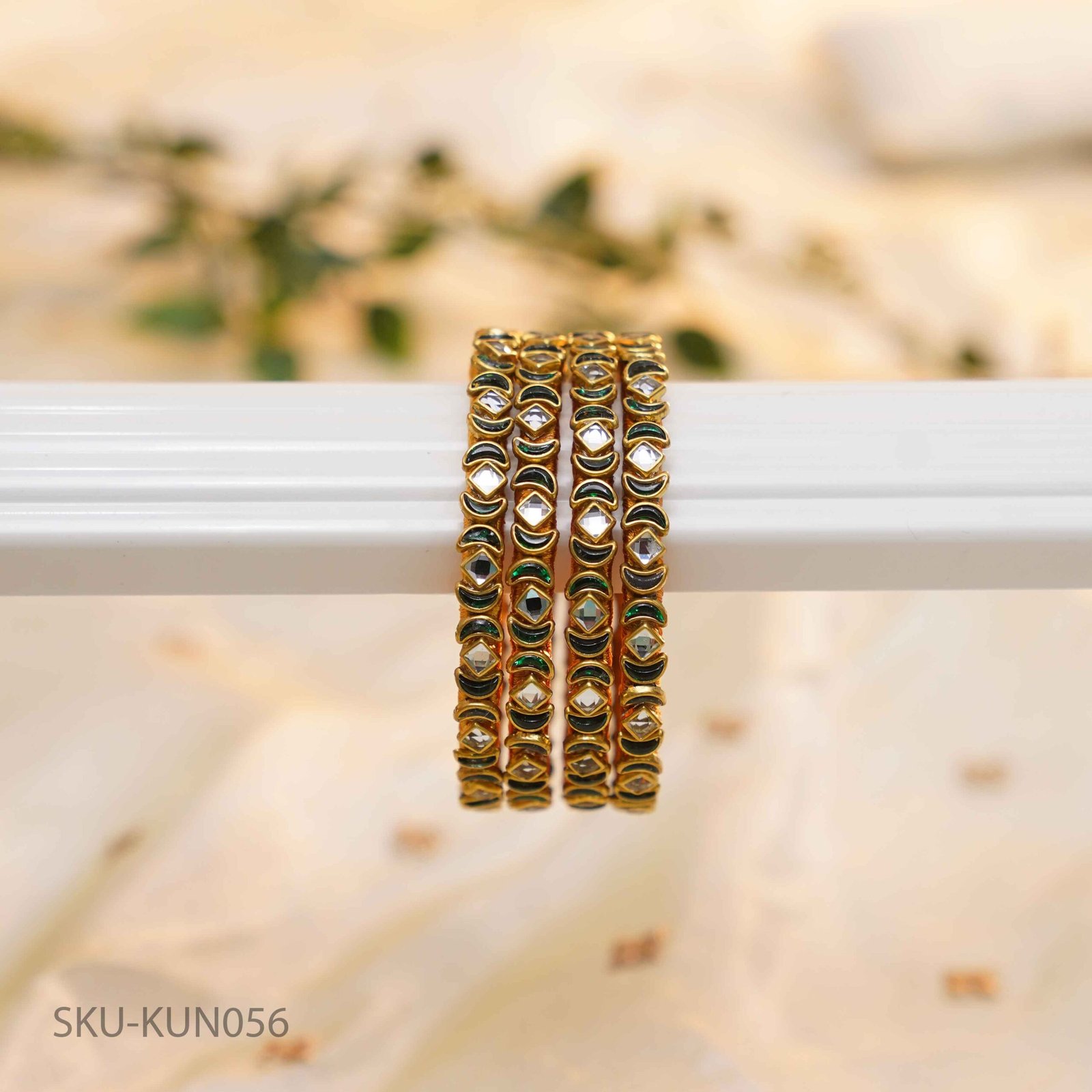 A graceful set of handcrafted bangles with a rich thread base and adorned with elegant kundan work. The emerald green detailing with sparkling kundans creates a timeless design, perfect for festive occasions, weddings, or to add a regal touch to any outfit. Lightweight yet luxurious, these bangles are designed for all-day comfort without compromising on style.