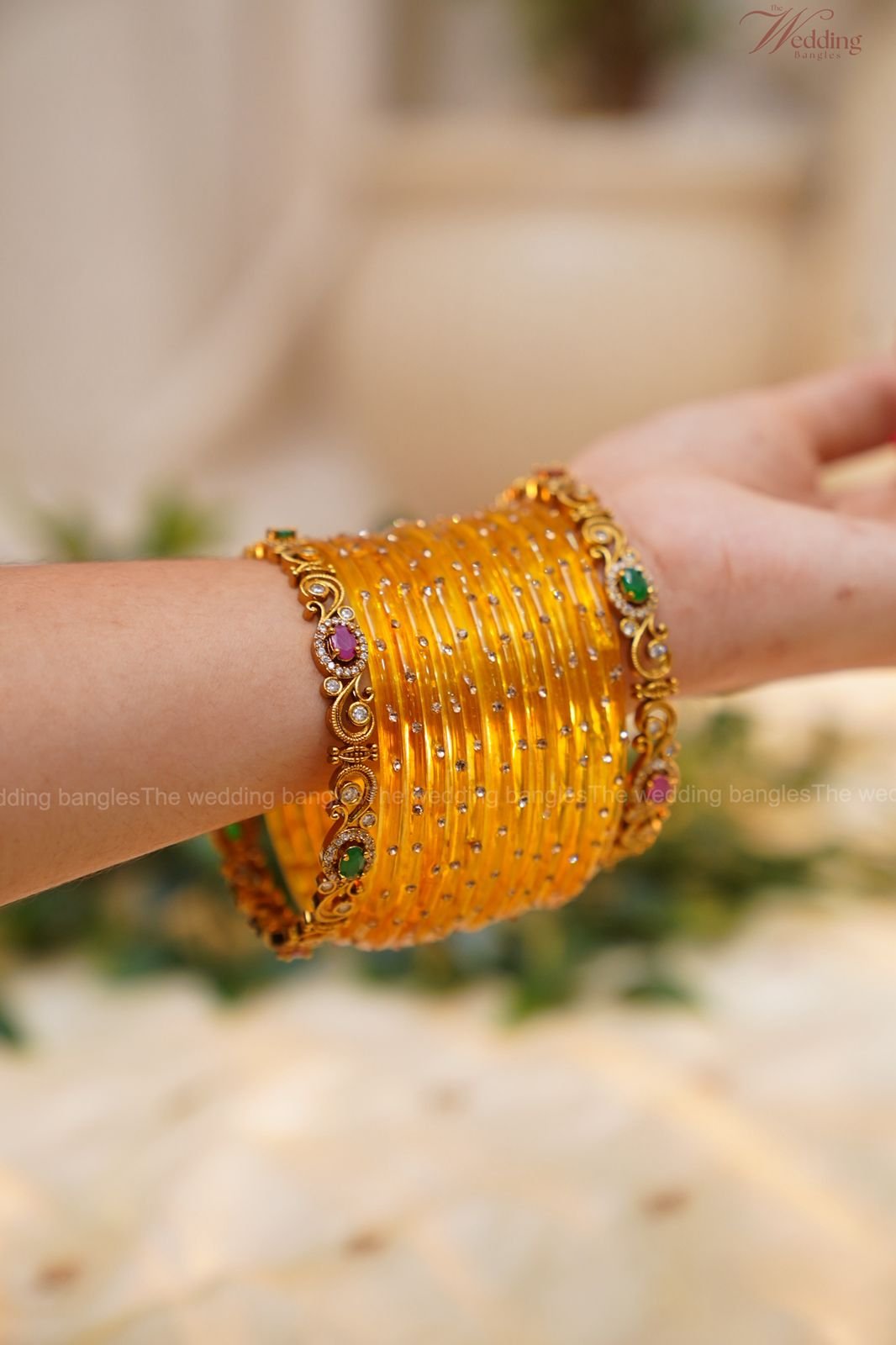 Bright and elegant, the Golden Swirl Bangle Set is a perfect fusion of antique artistry and festive charm. The side bangles feature Royal Swirl Spark antique bangles (Ant033) with detailed CZ embellishments, paired with yellow single stone glass bangles (SSD002) in the center. The golden tones and radiant yellow create a joyful, traditional look ideal for weddings, festivals, and celebrations.