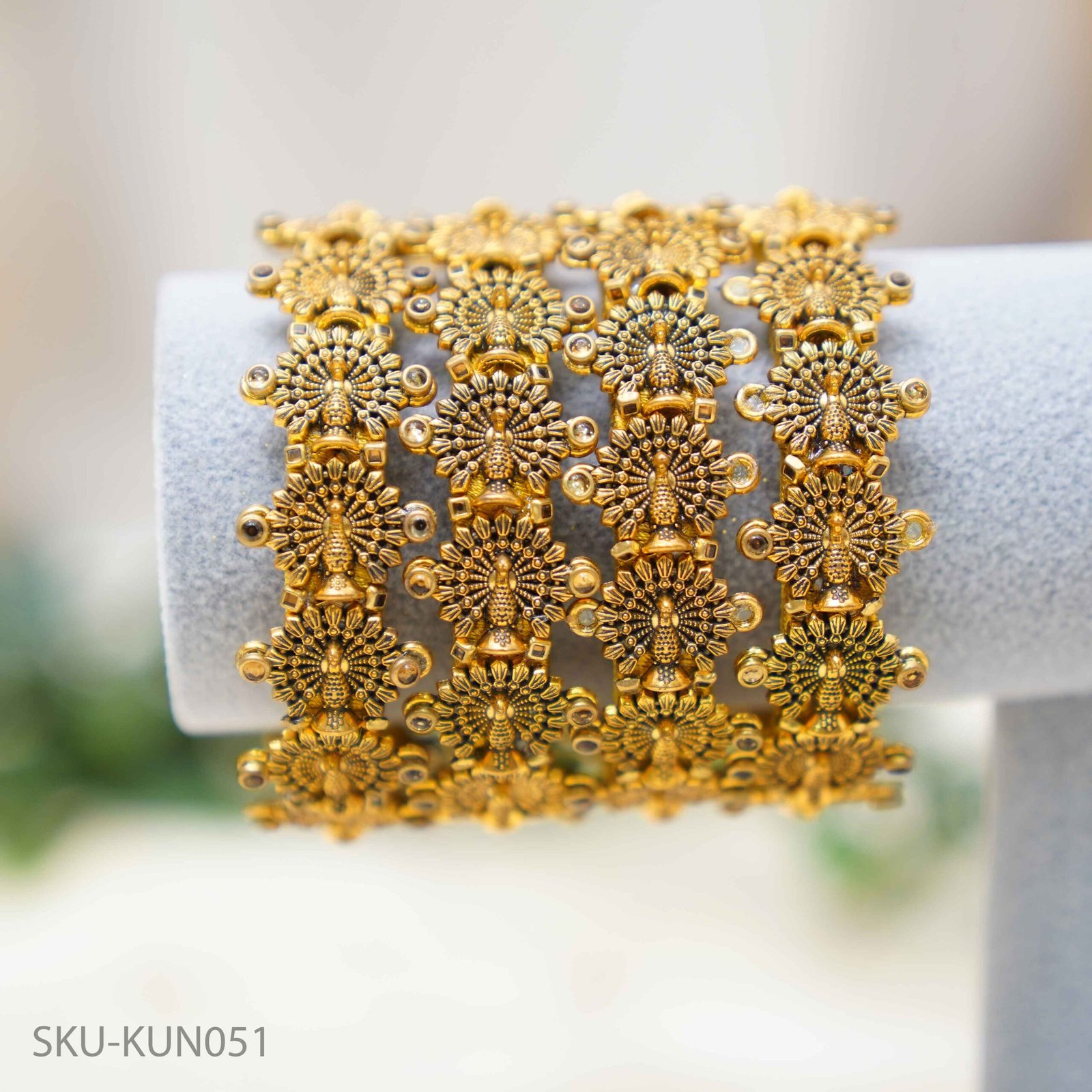 Celebrate timeless artistry with these Handmade Peacock Charm Bangles, crafted with intricate floral and peacock-inspired detailing in a luxurious antique gold finish. Every element is carefully handwoven, giving the bangles a regal aura and vintage charm that pairs beautifully with both sarees and lehengas.