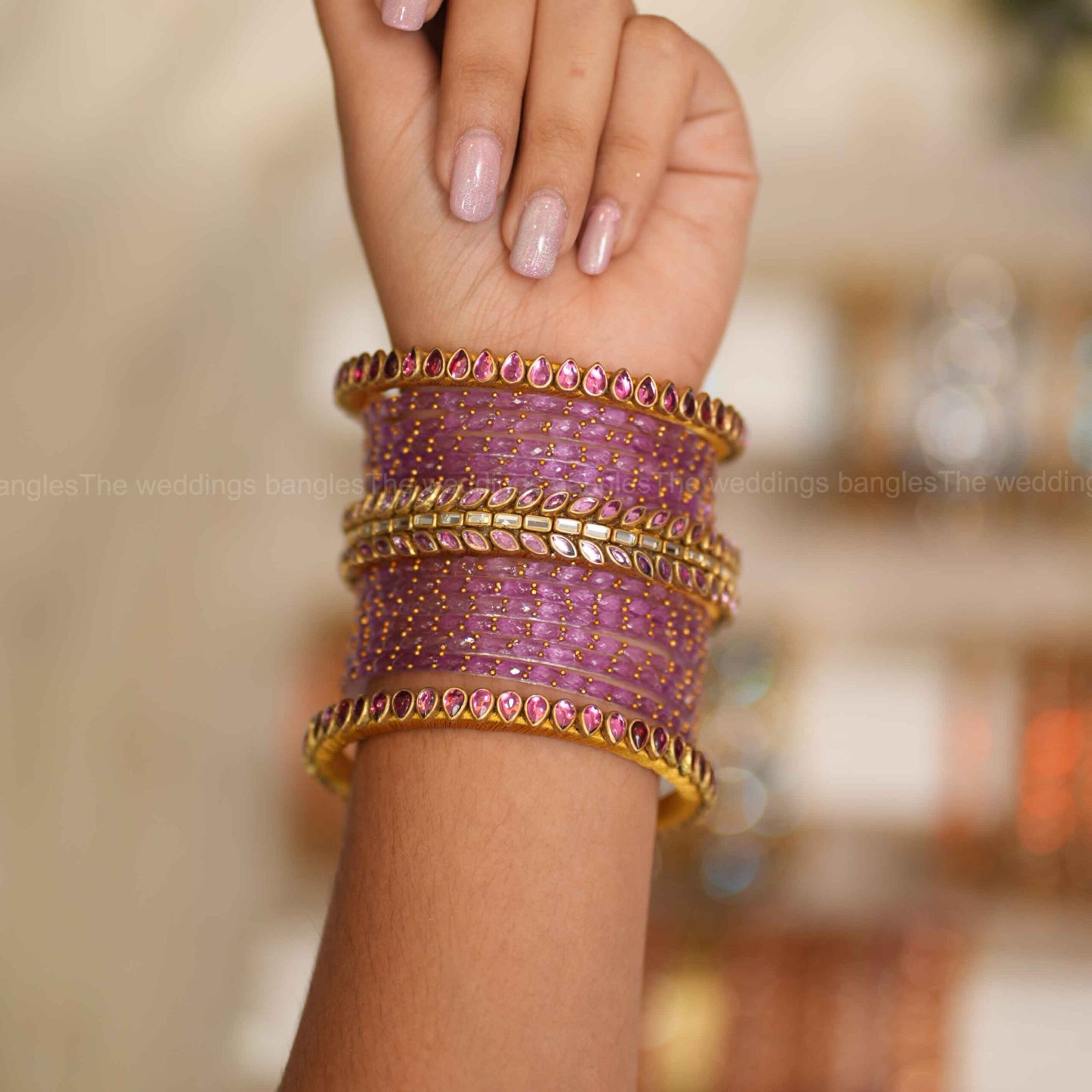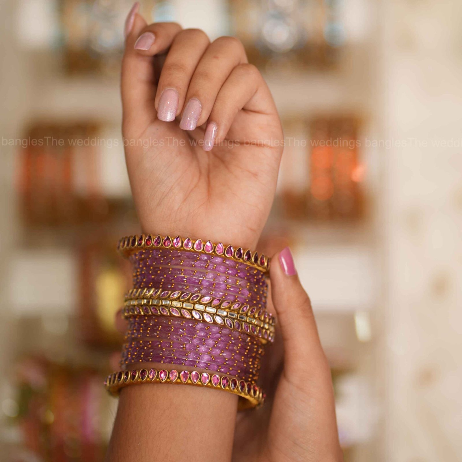 Soft, elegant, and graceful – the Lavender Glow Bridal Bangle Set is designed to add a subtle charm to your festive and bridal attire. Featuring glossy lavender-toned glass bangles detailed with golden dotted accents, the set is beautifully paired with antique gold-finish kadas embellished with pink teardrop kundans and a statement kada featuring dual rows of leaf-cut kundans.