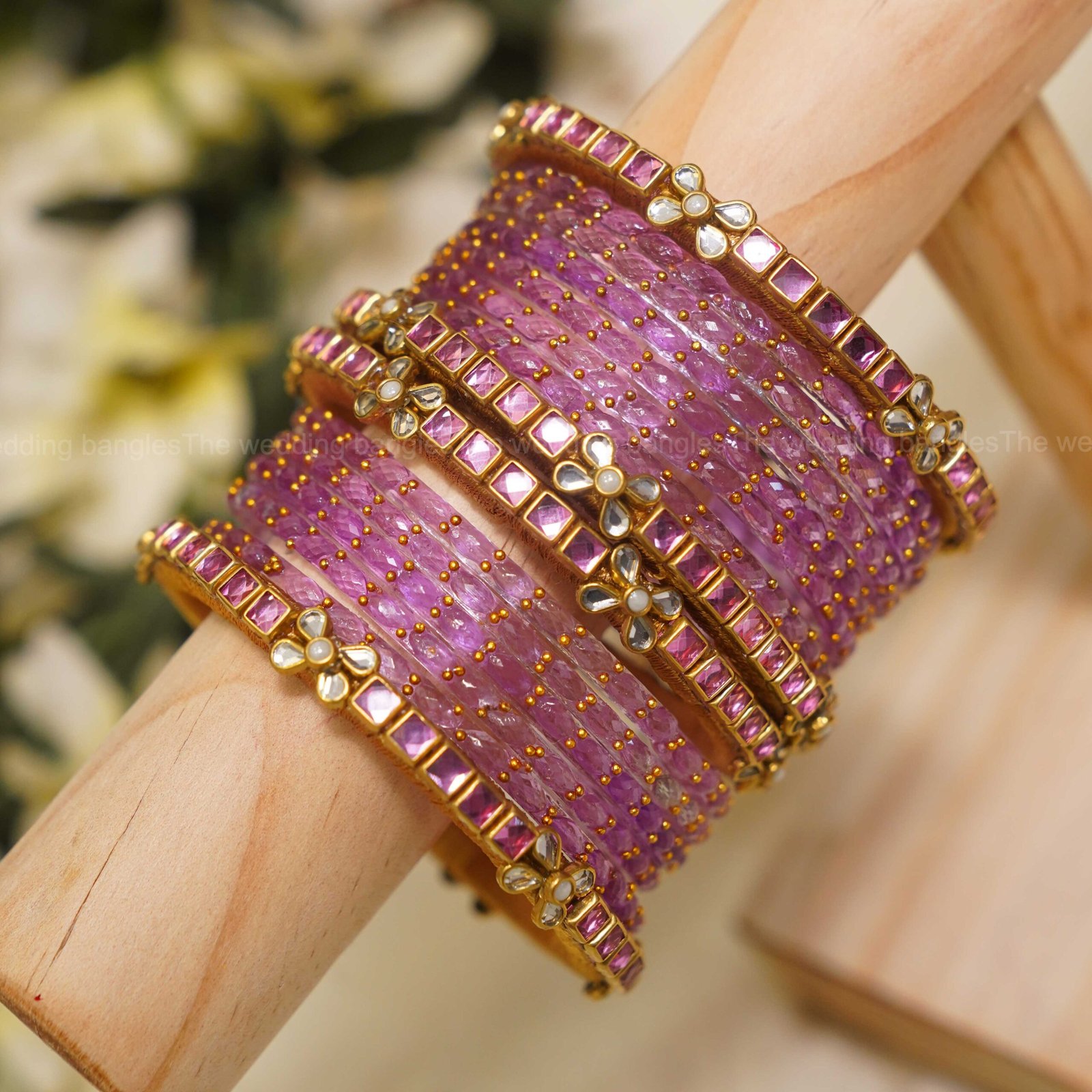 A royal blend of elegance and festive charm! This gorgeous set features lavender-toned glass bangles beautifully paired with gold-finish kadas studded with square kundan stones and delicate floral detailing. The soft lavender shade adds a graceful touch, while the golden embellishments elevate its grandeur—making it the perfect choice for weddings, festive gatherings, and traditional occasions.