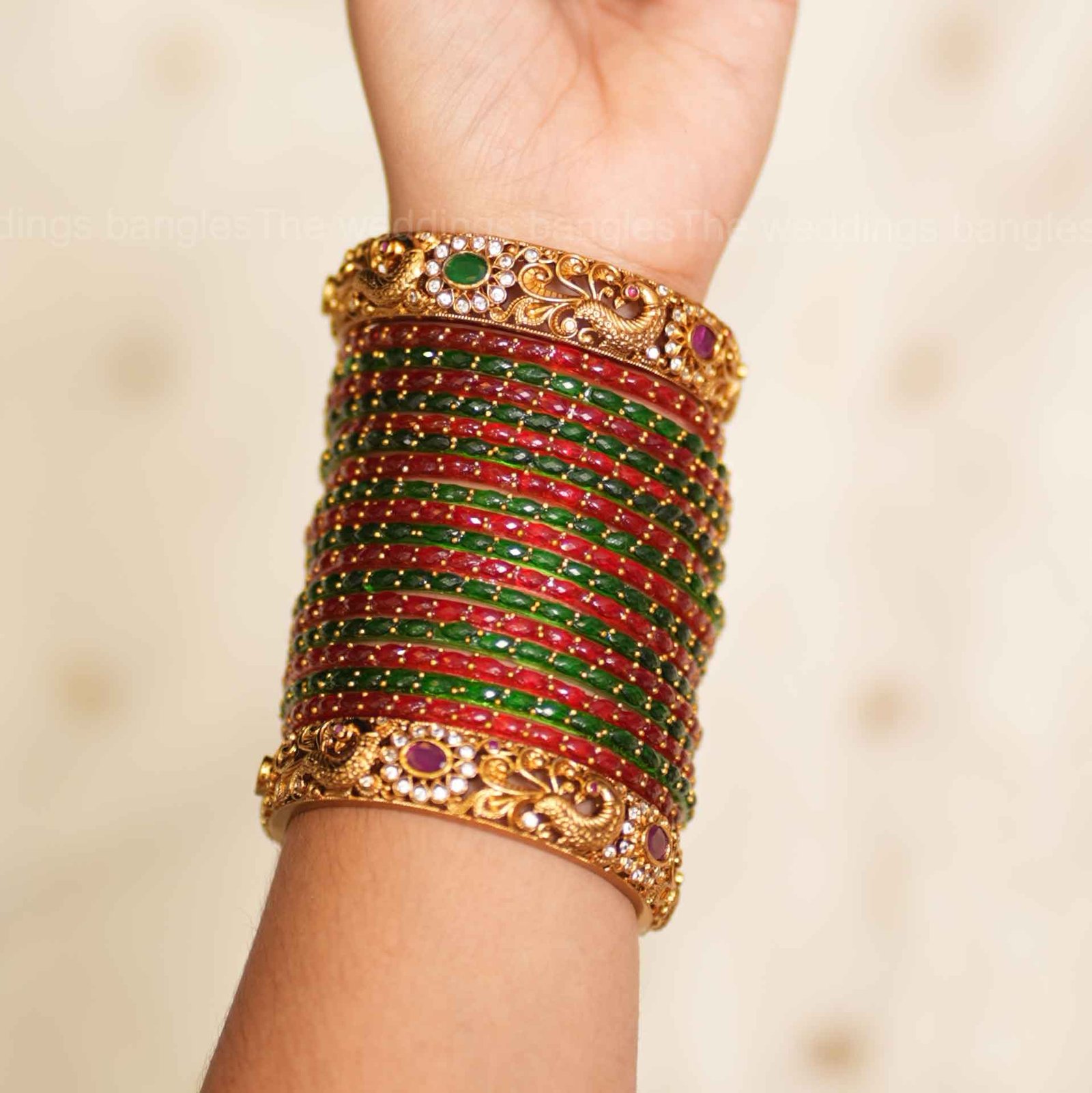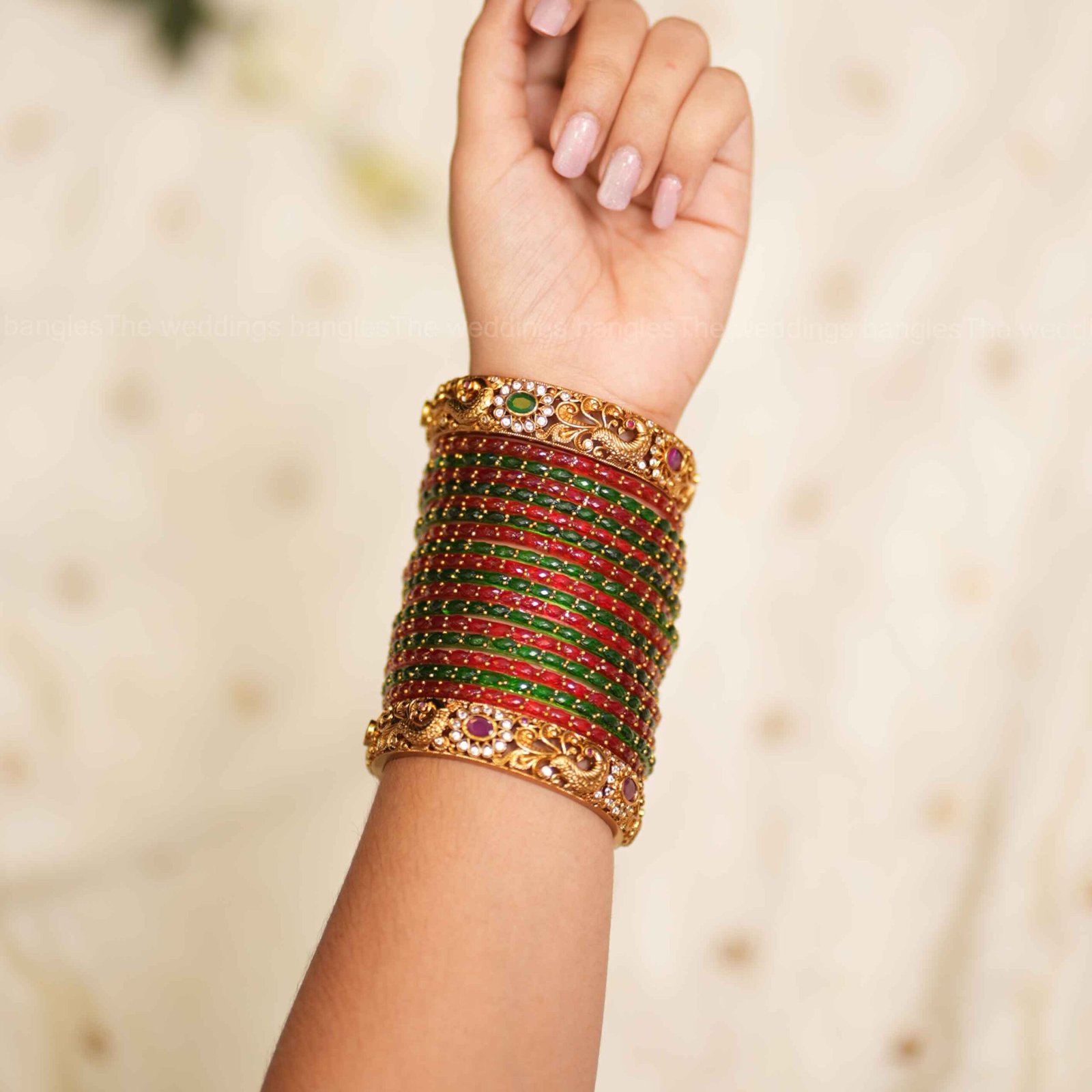 Rich, divine, and full of heritage – the Mayura Ratna Heritage Bangle Set is crafted to reflect royal elegance. The set features majestic Mayura Ratna kadas on the sides, designed in antique gold finish with intricate peacock-inspired detailing and ruby–emerald kundan accents. At the center, glossy raindrop glass bangles in vibrant green and ruby red shades with golden dotted accents create a radiant festive look.