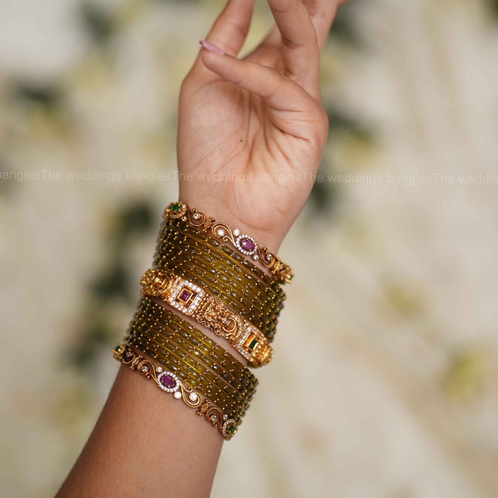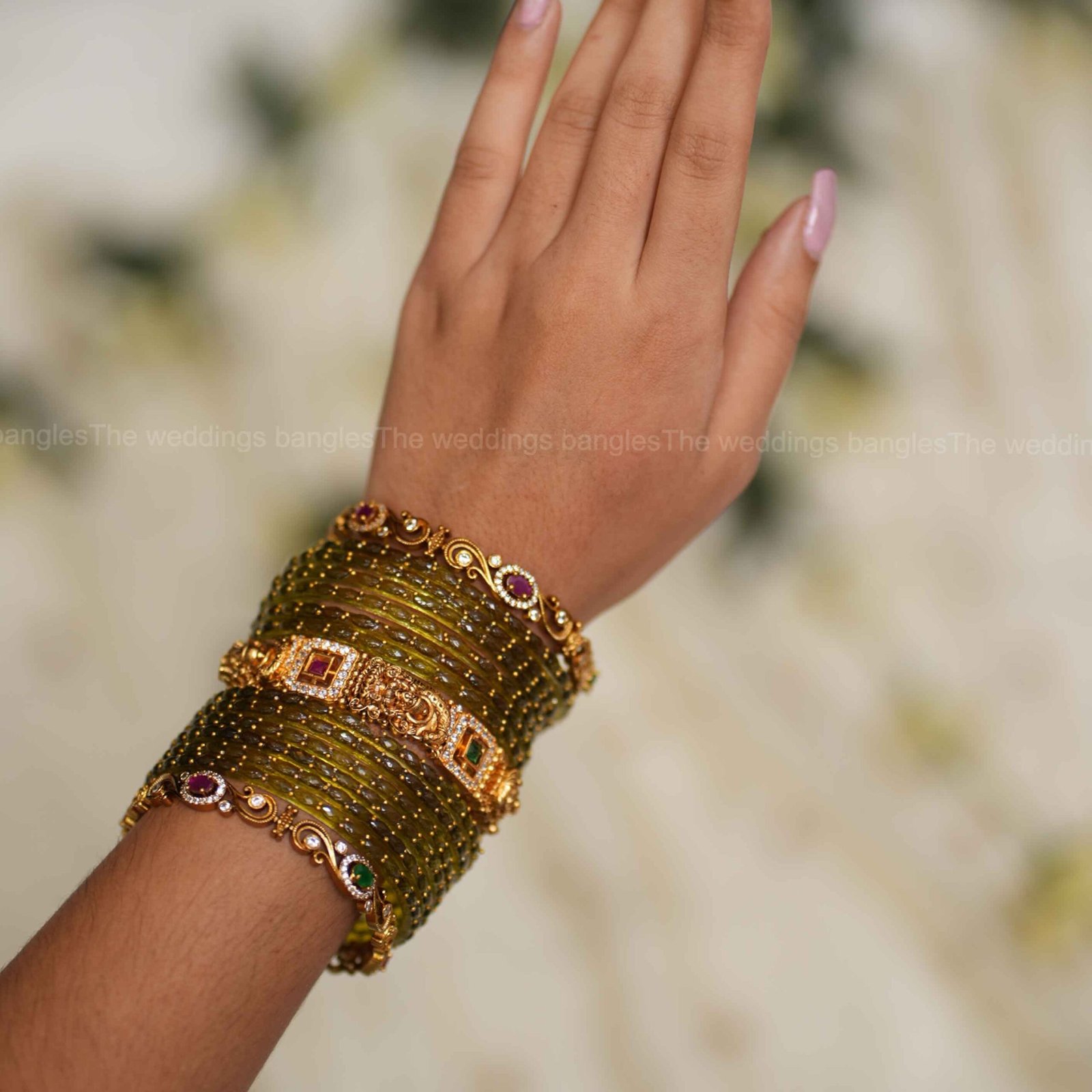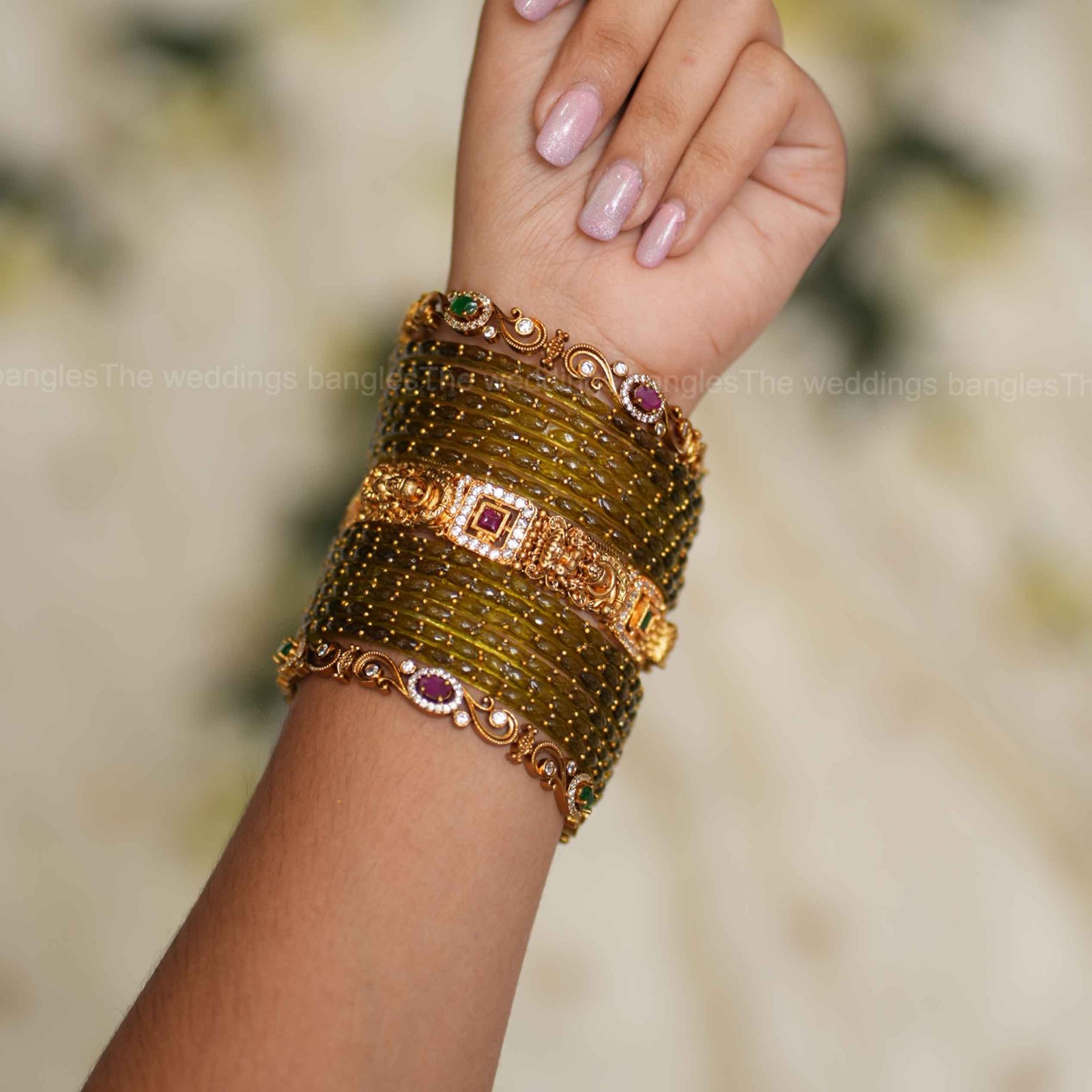 - Middle Bangle: Divya Ratna Lakshmi Bangles – temple-inspired bangle with goddess motifs, kundan accents, and intricate gold detailing symbolising prosperity and grace.
