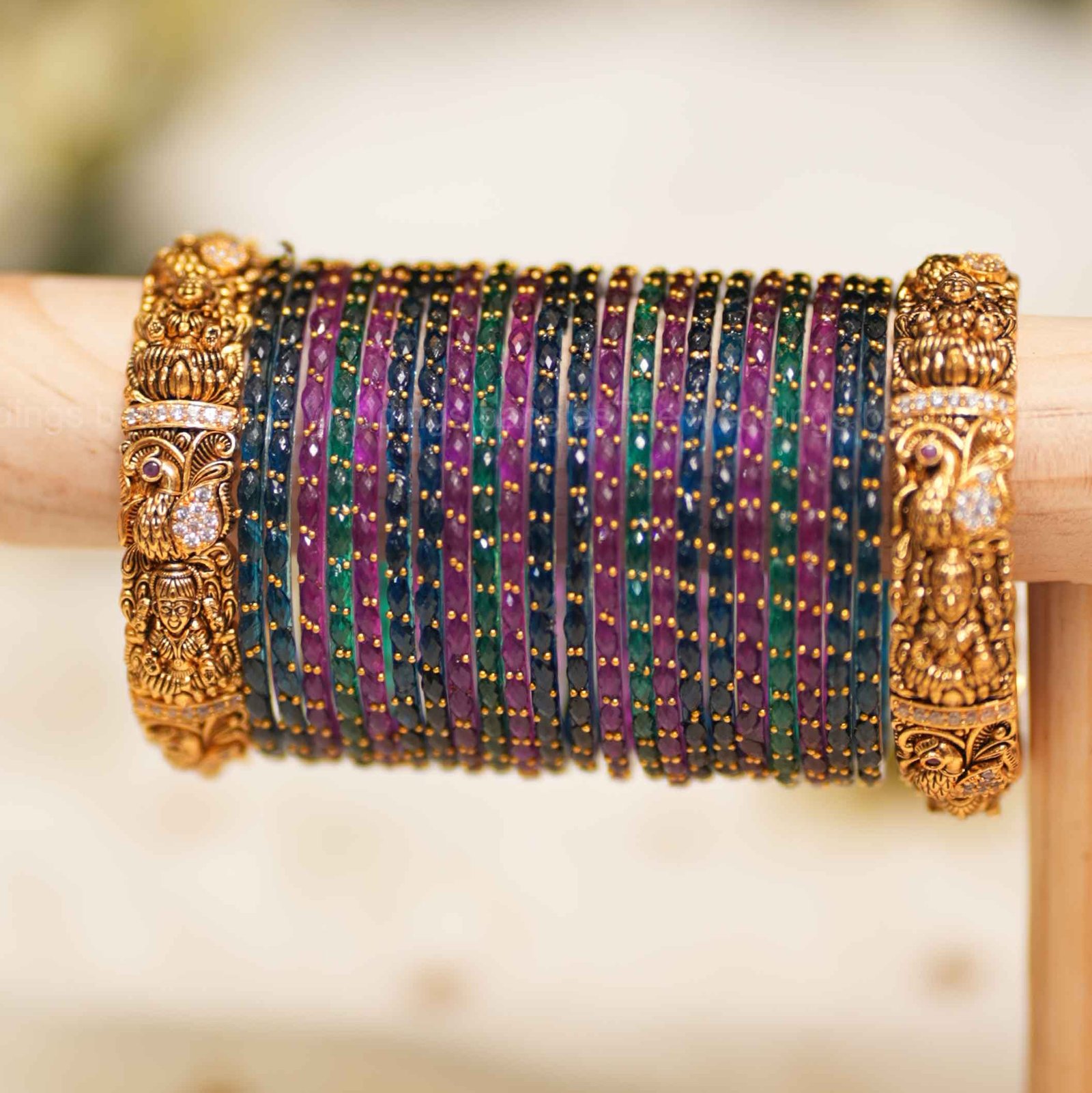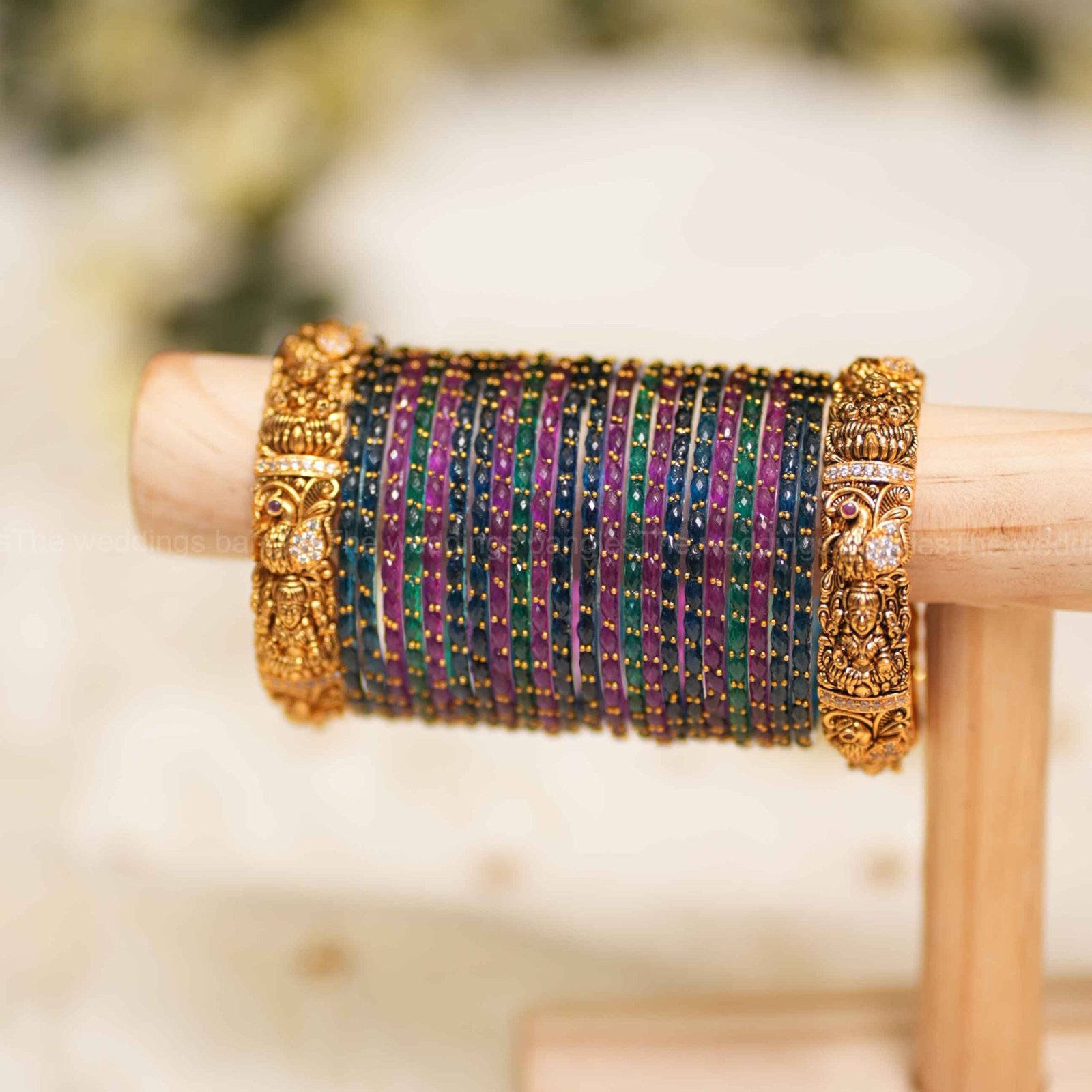 A masterpiece of tradition and grandeur – the Peacock Devi Heritage Bangle Set is designed to radiate divine charm. The set features majestic Peacock Devi heritage kadas on the sides, crafted in antique gold finish with intricate detailing and peacock-inspired motifs. At the center, glossy raindrop glass bangles in shades of sapphire blue, emerald green, and royal purple with dotted accents create a rich, regal aura.