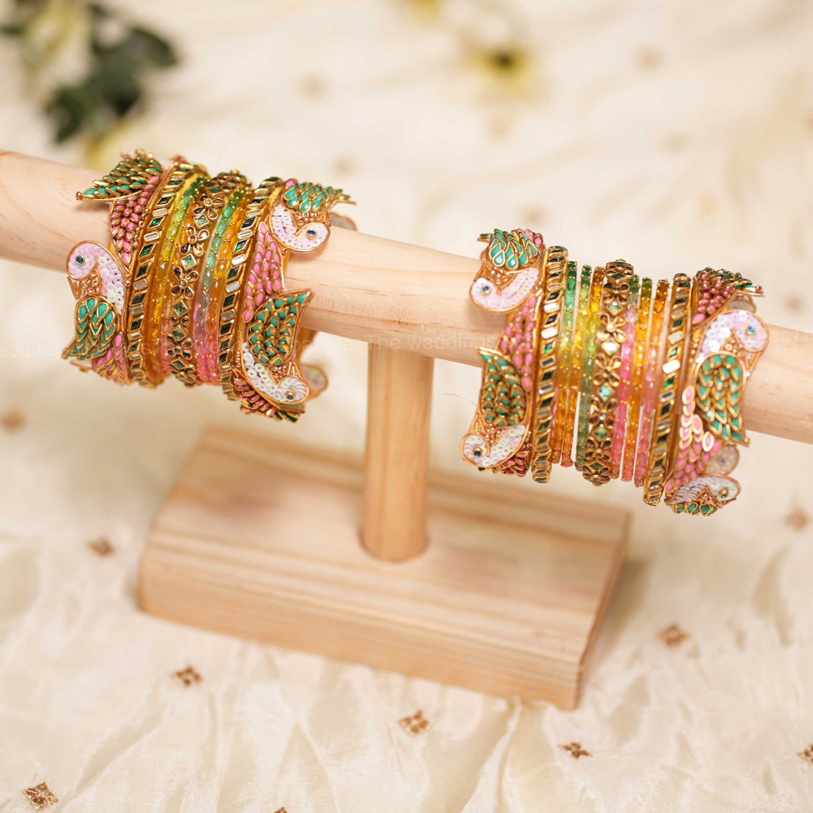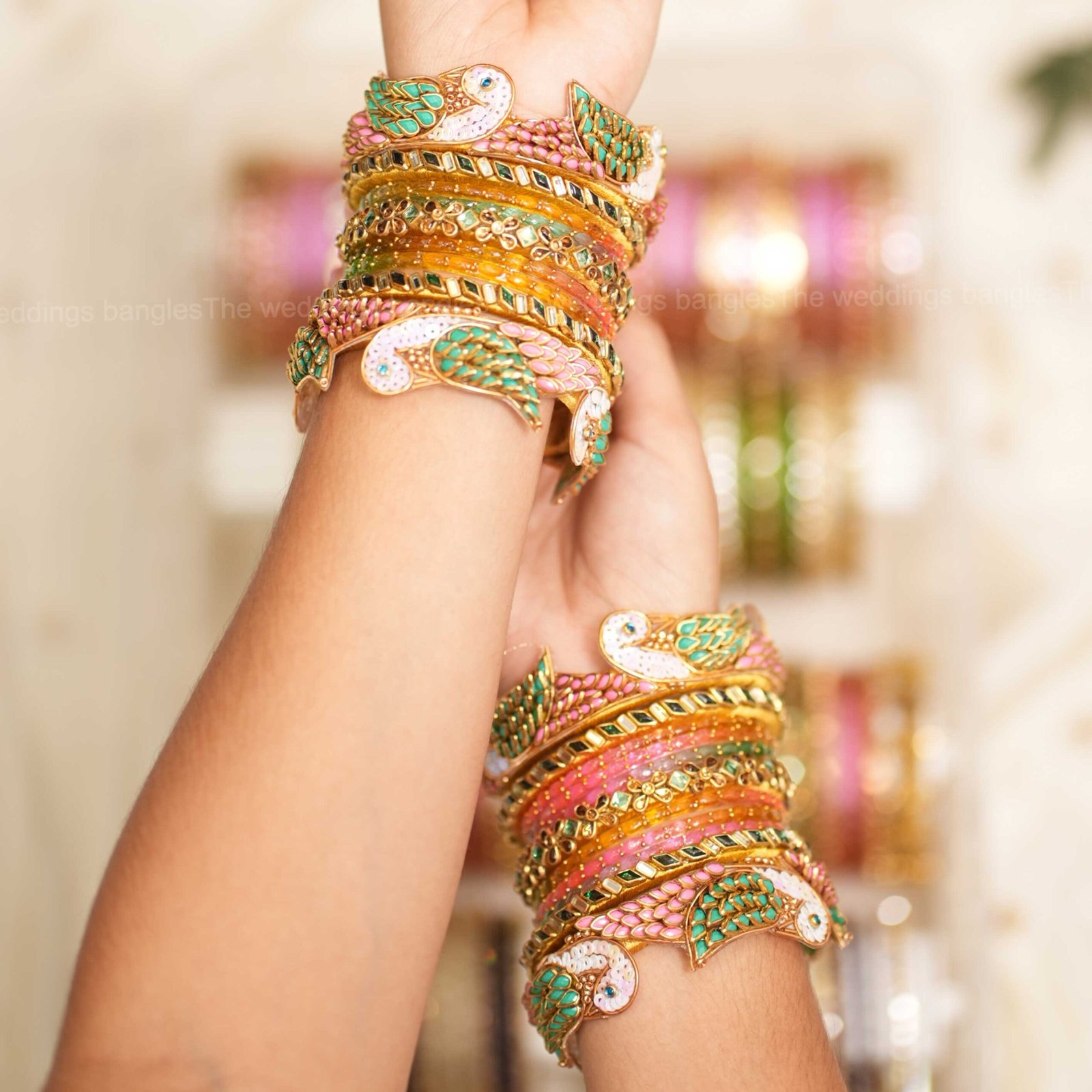 Step into elegance with this enchanting bridal bangle set featuring majestic peacock motif kada bangles on the sides. Paired with shimmering glass bangles in hues of coral pink and golden amber, and embellished with gold-toned accents, this set radiates grace and tradition. The intricate enamel work and detailed design make it a standout for any bride or festive celebration.