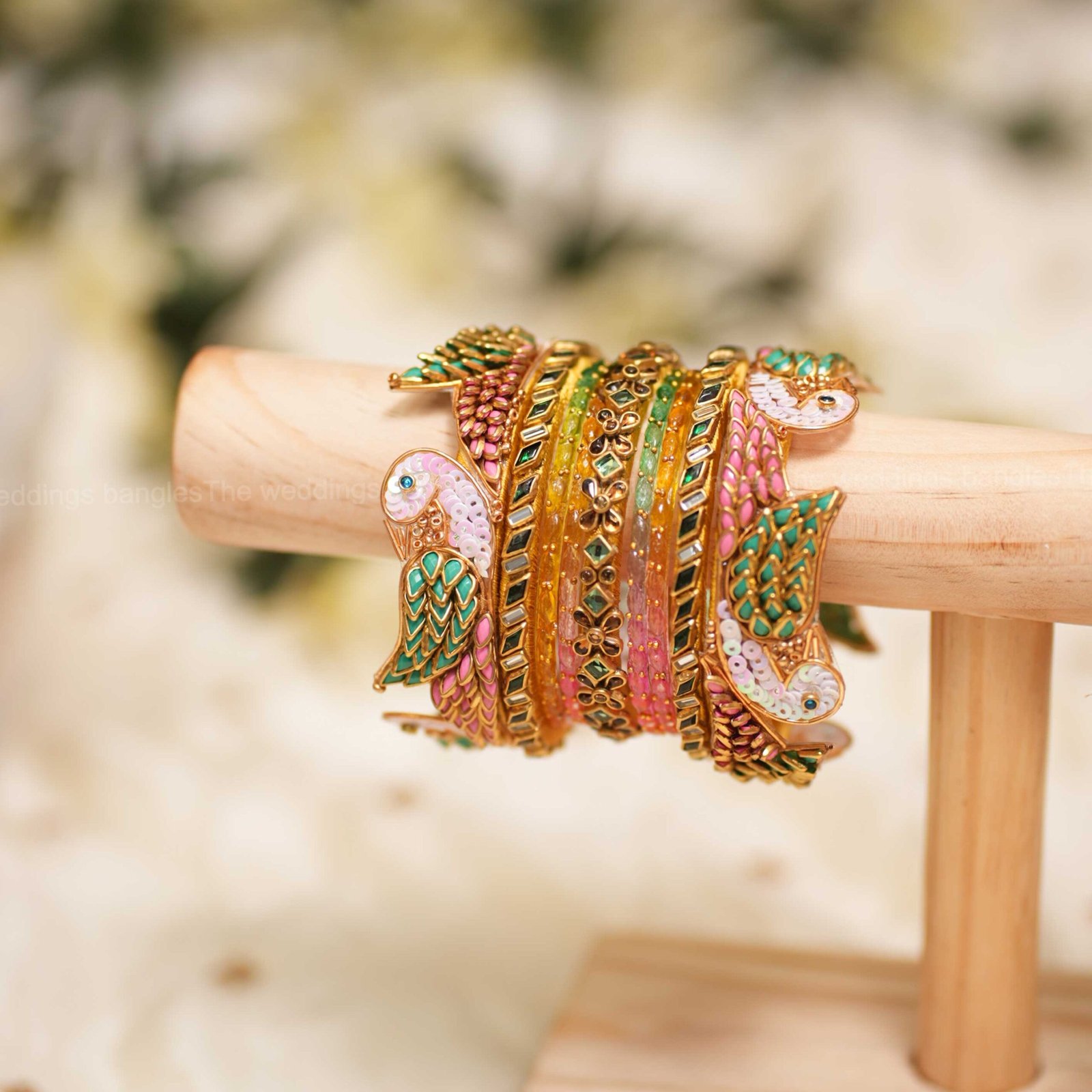 4 peacock handmade Side Bangles – Handcrafted peacock motif kada bangles with enamel detailing.