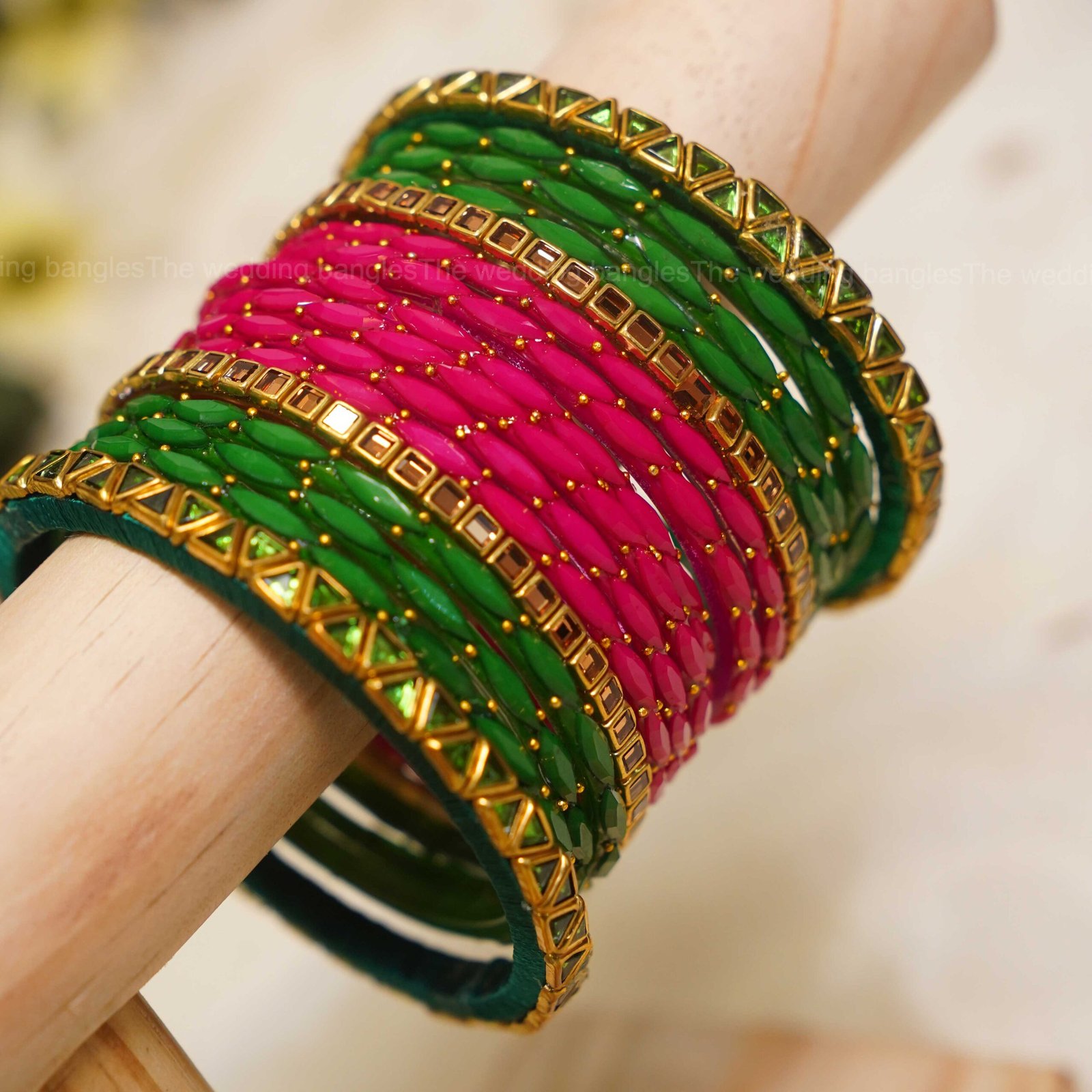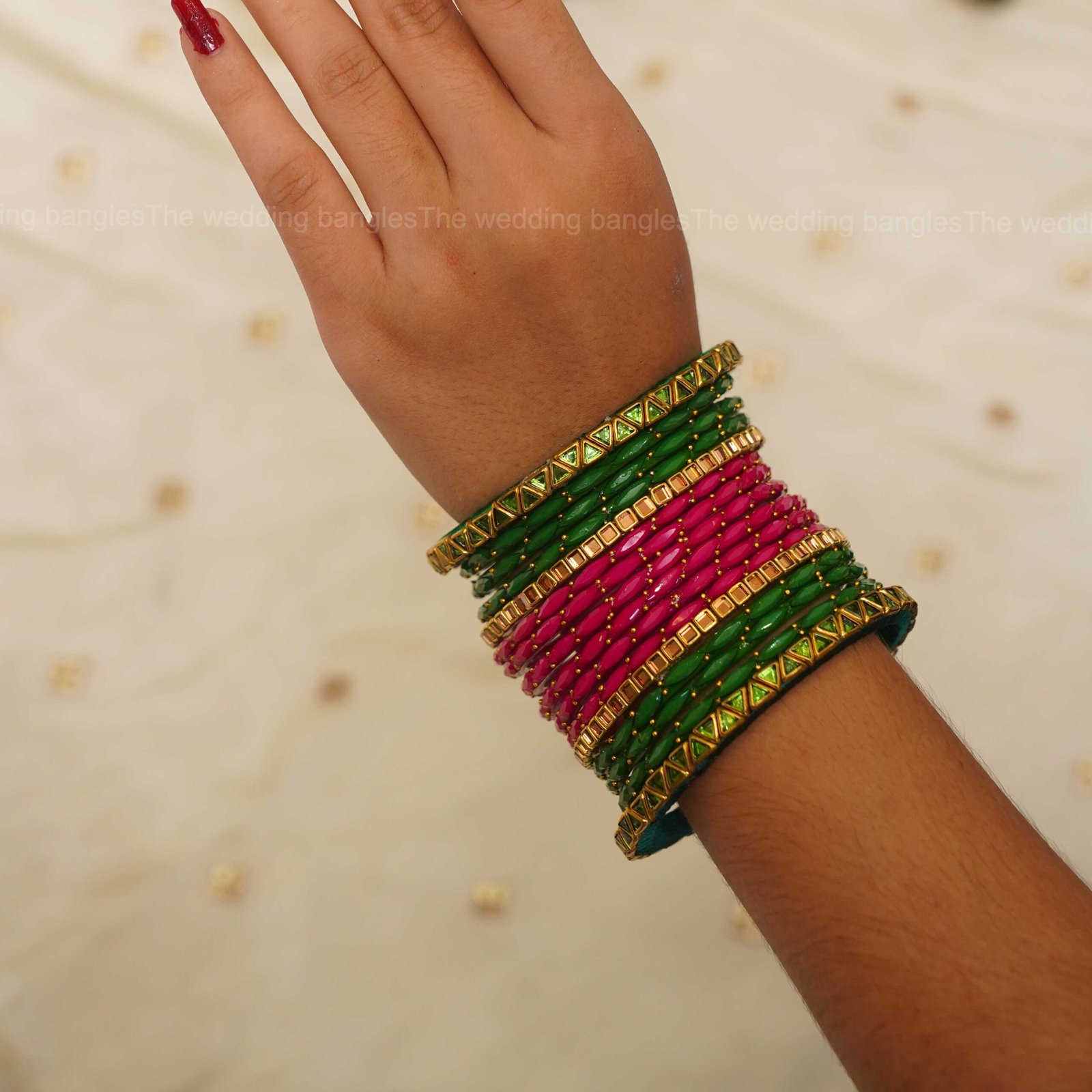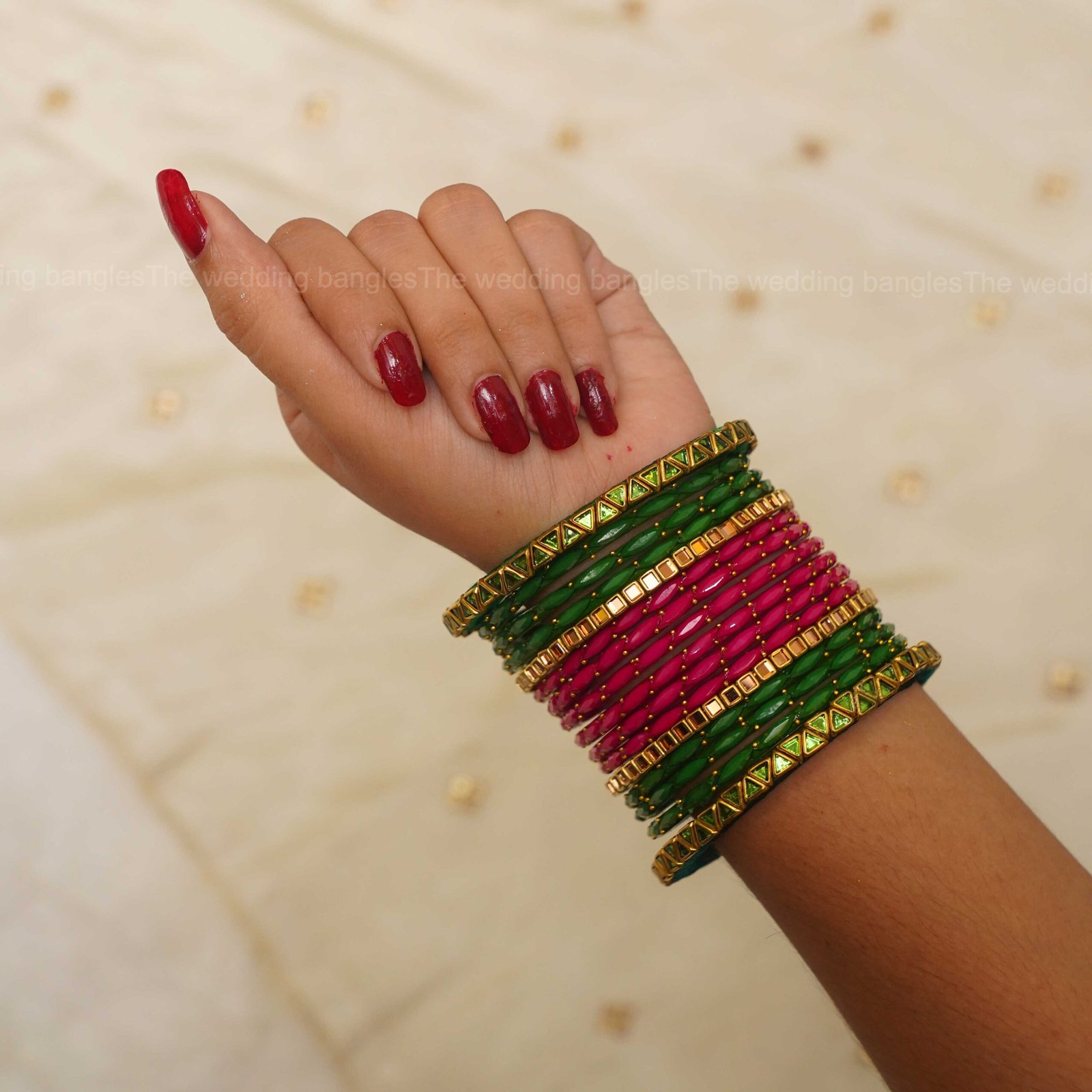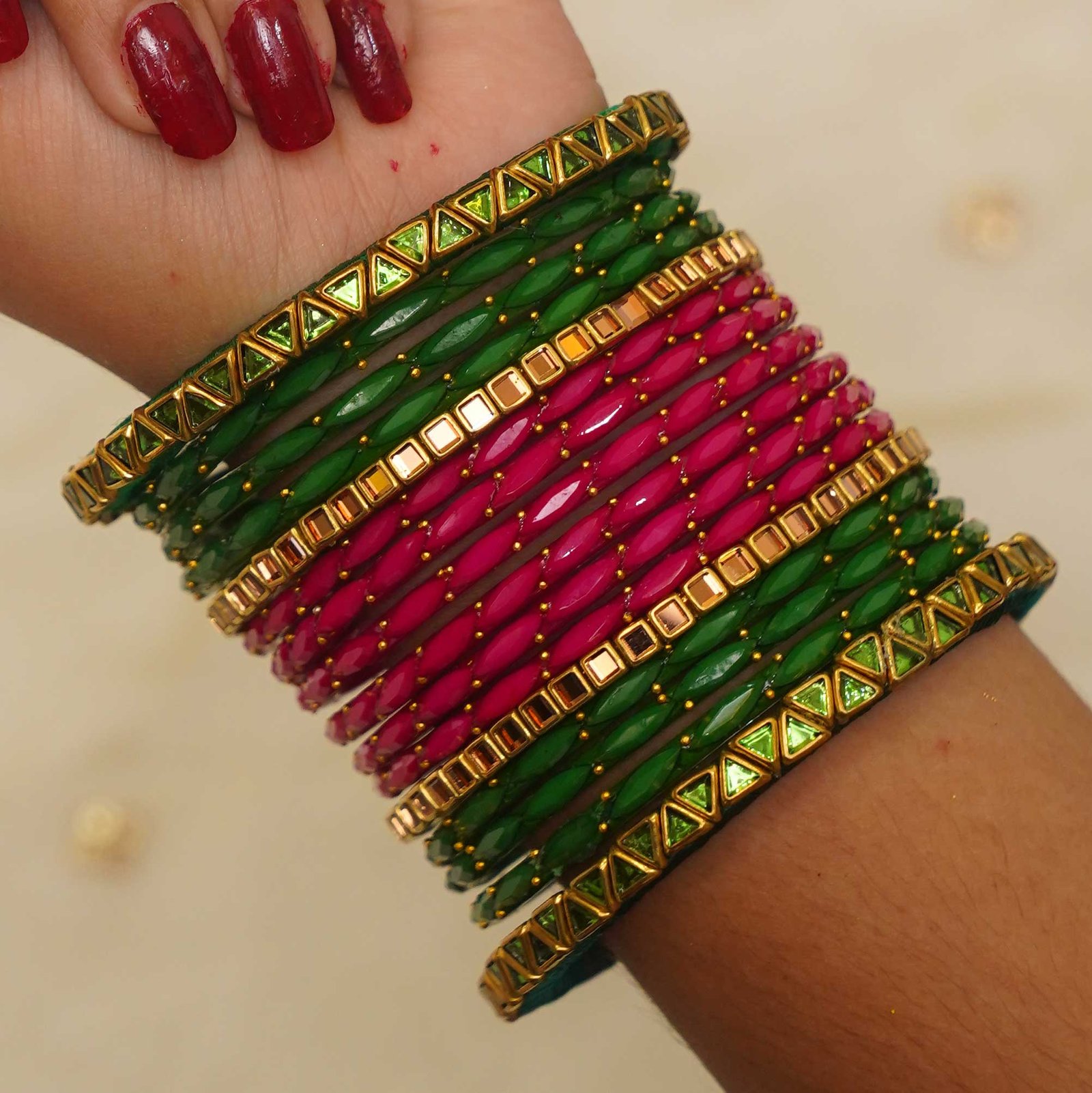 Celebrate the beauty of tradition with the prism Glow Bridal Bangle Set – a vibrant mix of rich green and deep pink tones. The premium glass bangles, highlighted with golden bead detailing, are paired with antique gold-finish kadas adorned with kundan stones in triangular and square patterns.