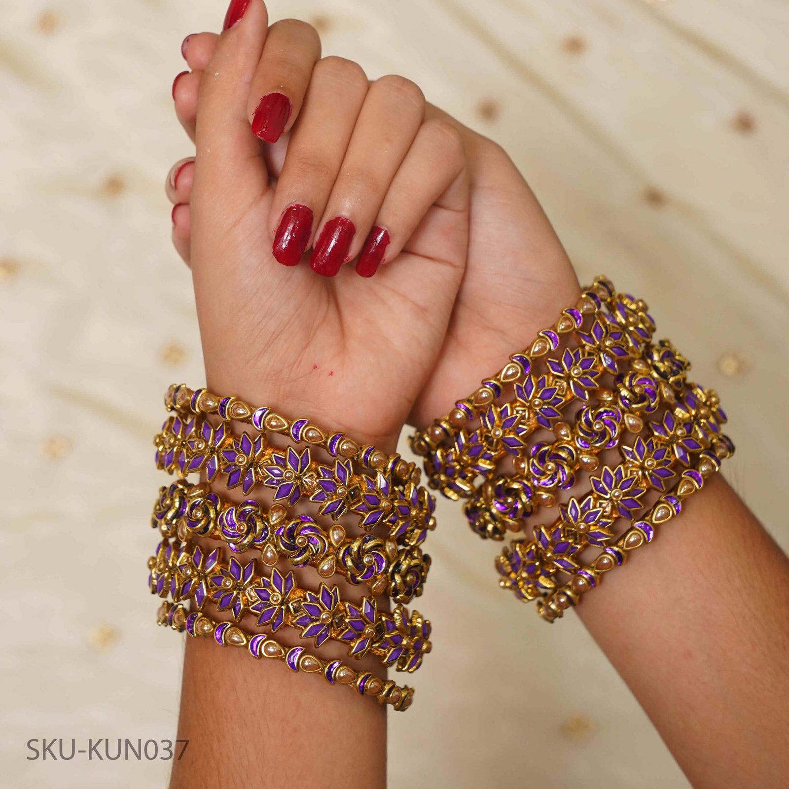Handmade with elegance, these exquisite bangles are crafted using thread and kundan, adorned with delicate floral motifs in regal purple and gold. Perfect for weddings, festive occasions, and special celebrations, they bring timeless grace to every look.