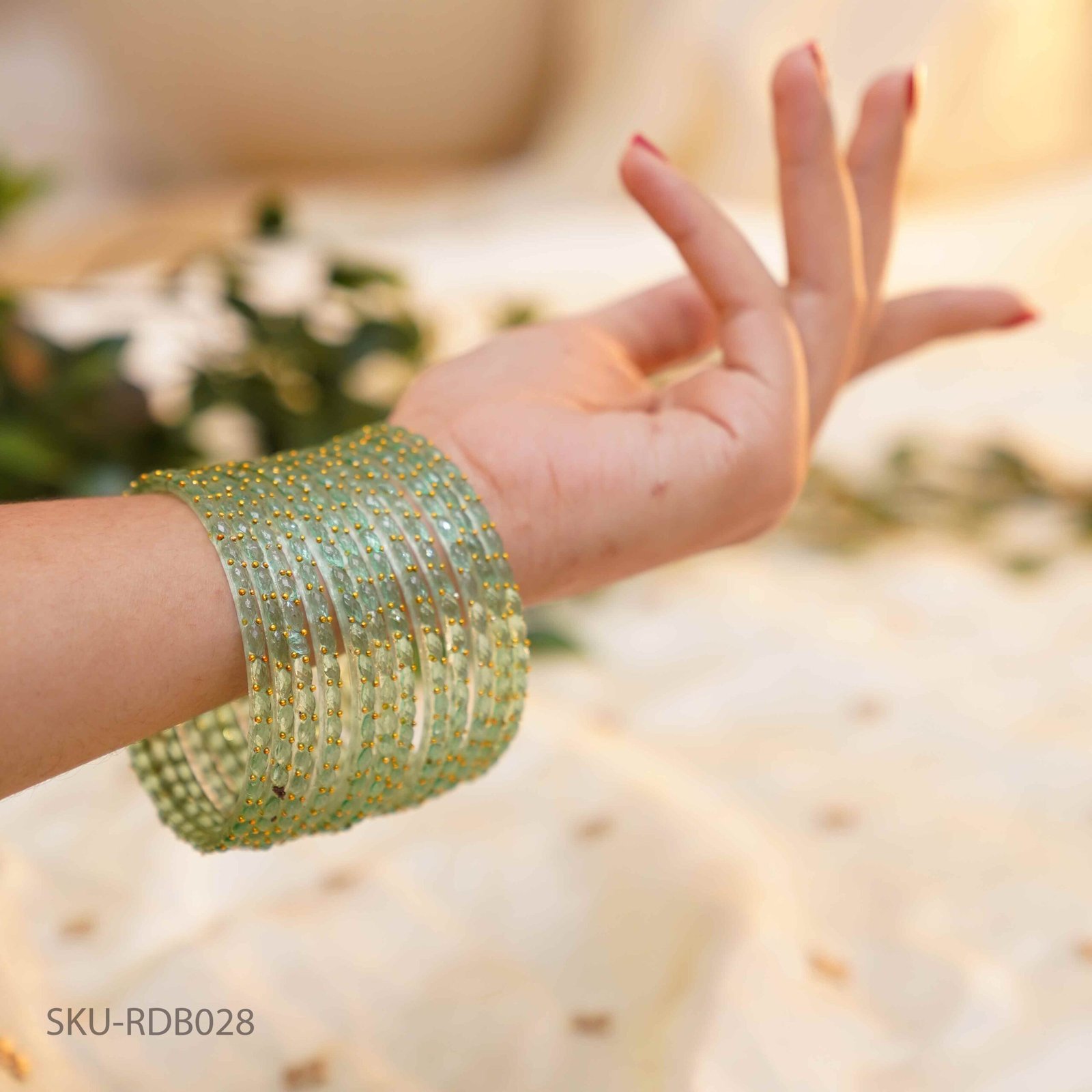 Add a touch of elegance to your festive and everyday looks with our Crystal Green Raindrop Bangles. Crafted from premium glass, these bangles feature a delicate raindrop design with golden bead accents, creating a shimmering finish that beautifully complements traditional and modern outfits alike. Lightweight yet striking, they are perfect for weddings, festivals, or daily wear.
