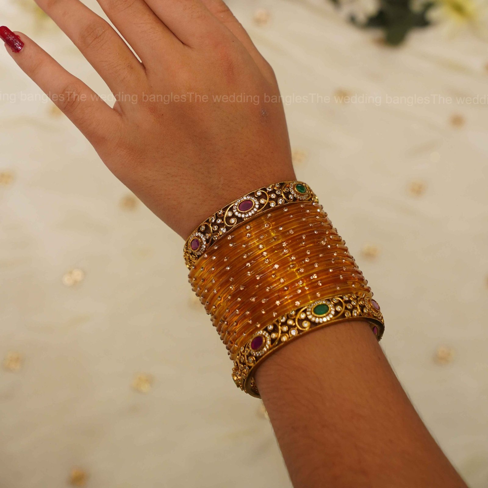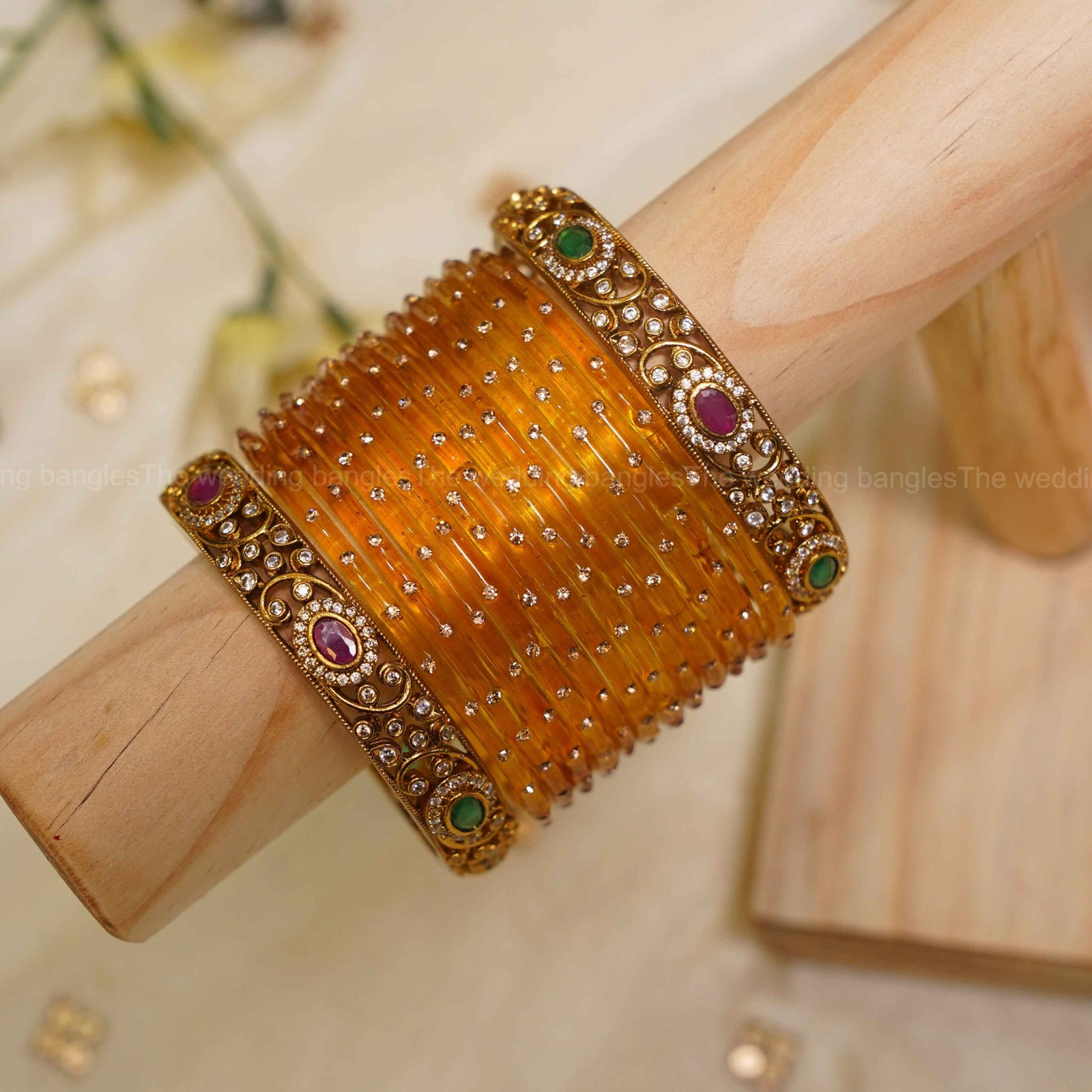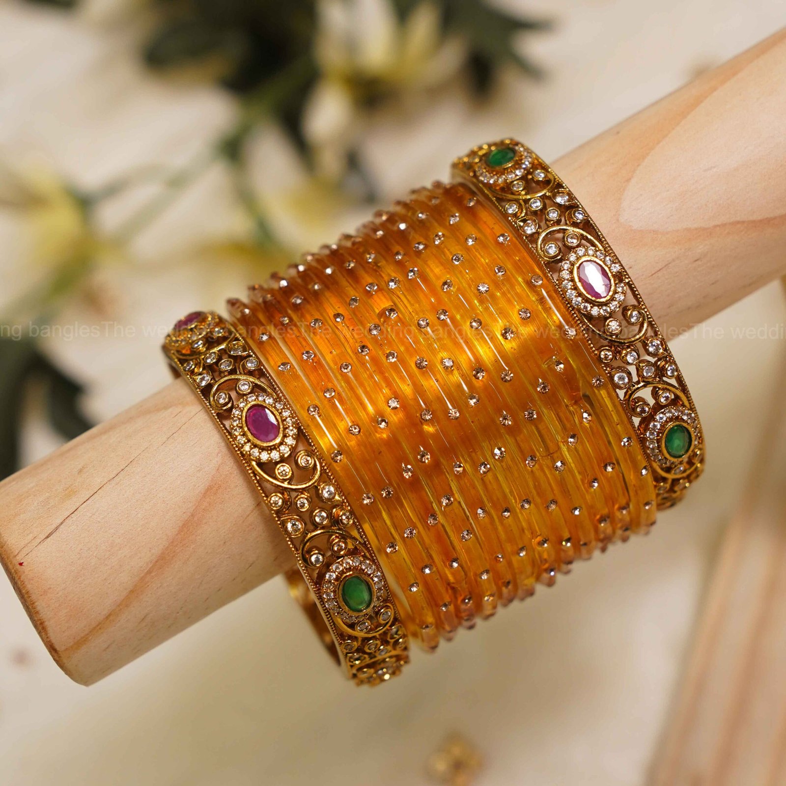 Traditional, regal, and full of charm – the Ratnavilasa Glow Bangle Set is crafted to make your festive look truly royal. The set features Ratnavilasa kadas on the sides, designed with antique gold finish and studded with ruby and emerald kundans for a heritage-inspired touch. At the center, glossy single stone golden-yellow glass bangles with delicate dotted accents add a radiant glow.