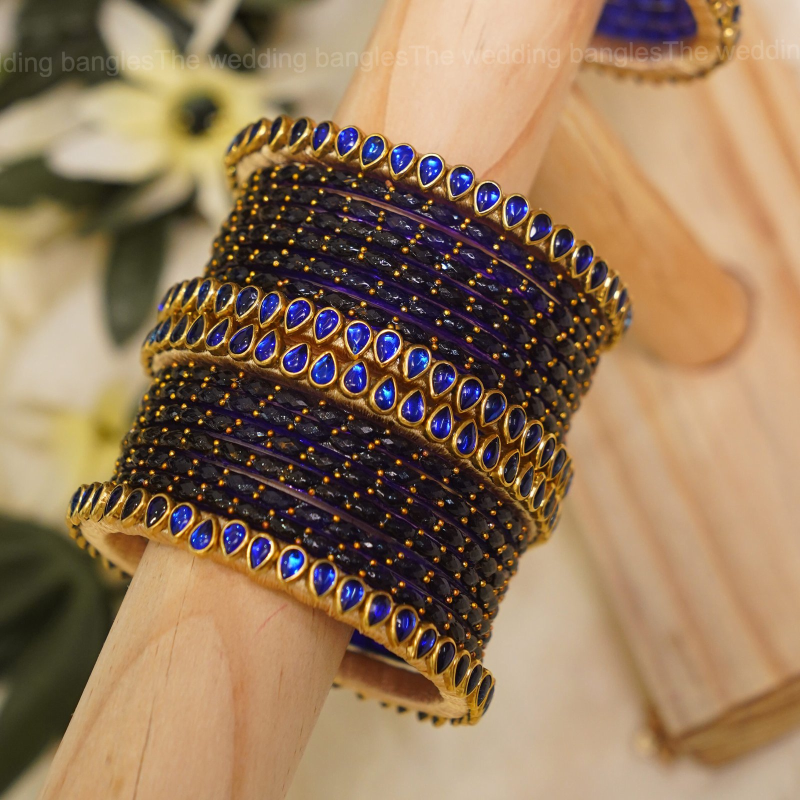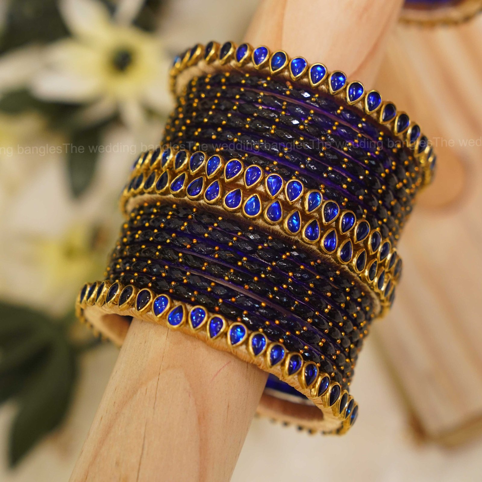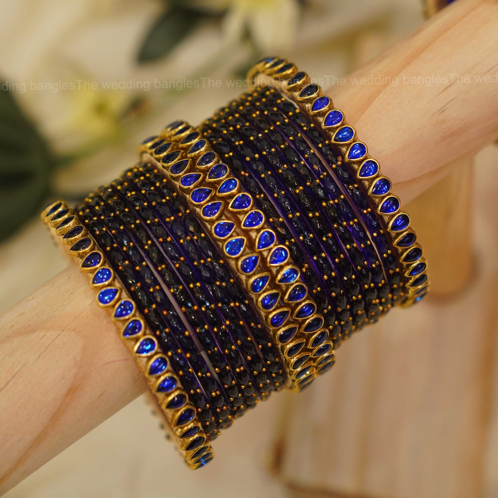 A regal masterpiece that radiates sophistication! The Royal Blue Spark Bridal Bangle Set features deep blue premium glass bangles enhanced with delicate golden bead accents. The set is beautifully paired with antique gold-finish kadas adorned with shimmering teardrop kundan stones in striking blue.