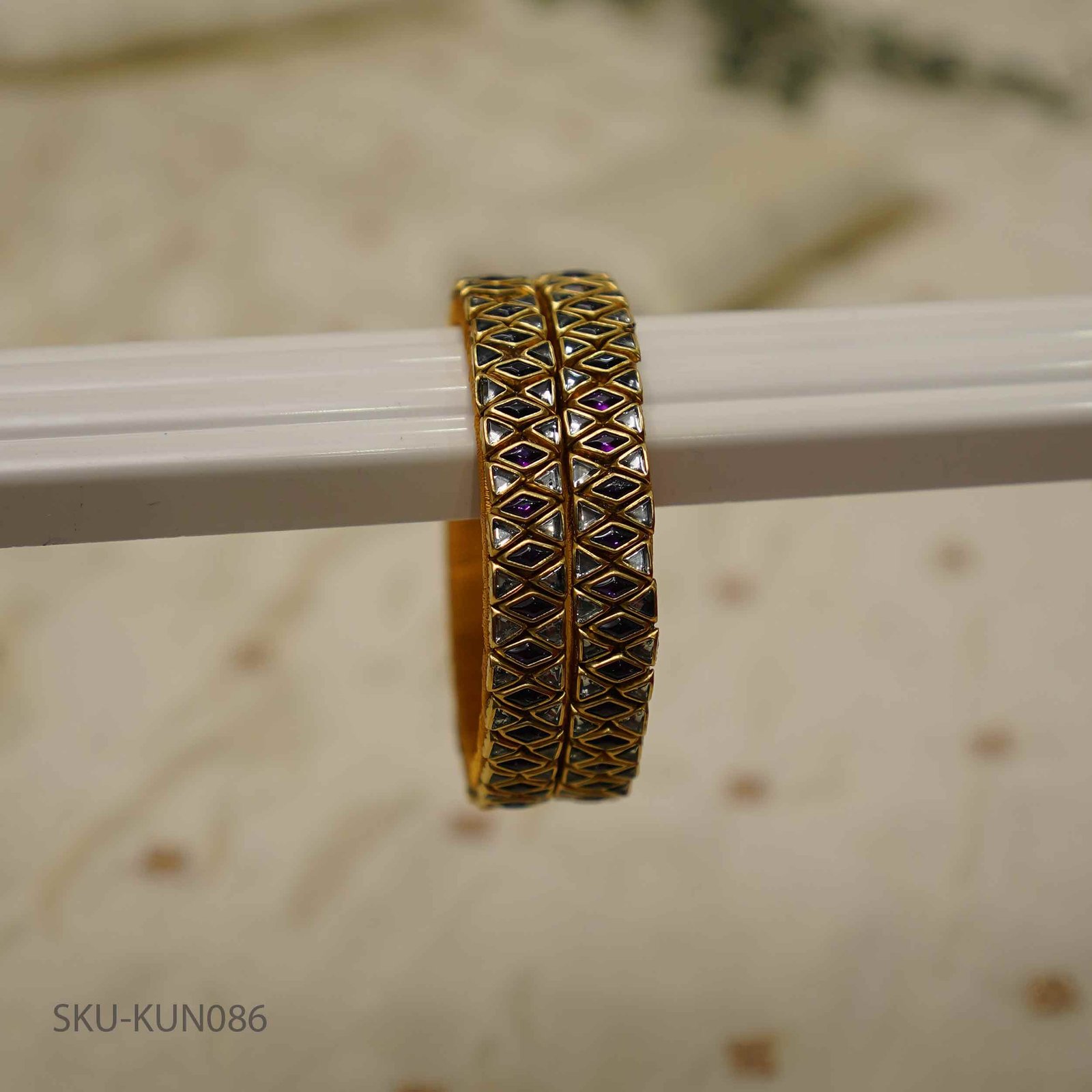 A stunning pair of handmade Kundan bangles featuring intricate geometric detailing and fine craftsmanship. Each bangle is adorned with diamond-shaped Kundan stones in rich hues, set beautifully in a golden base that radiates a royal charm. Perfect for festive wear, weddings, and traditional occasions, these bangles add a regal touch to any outfit.