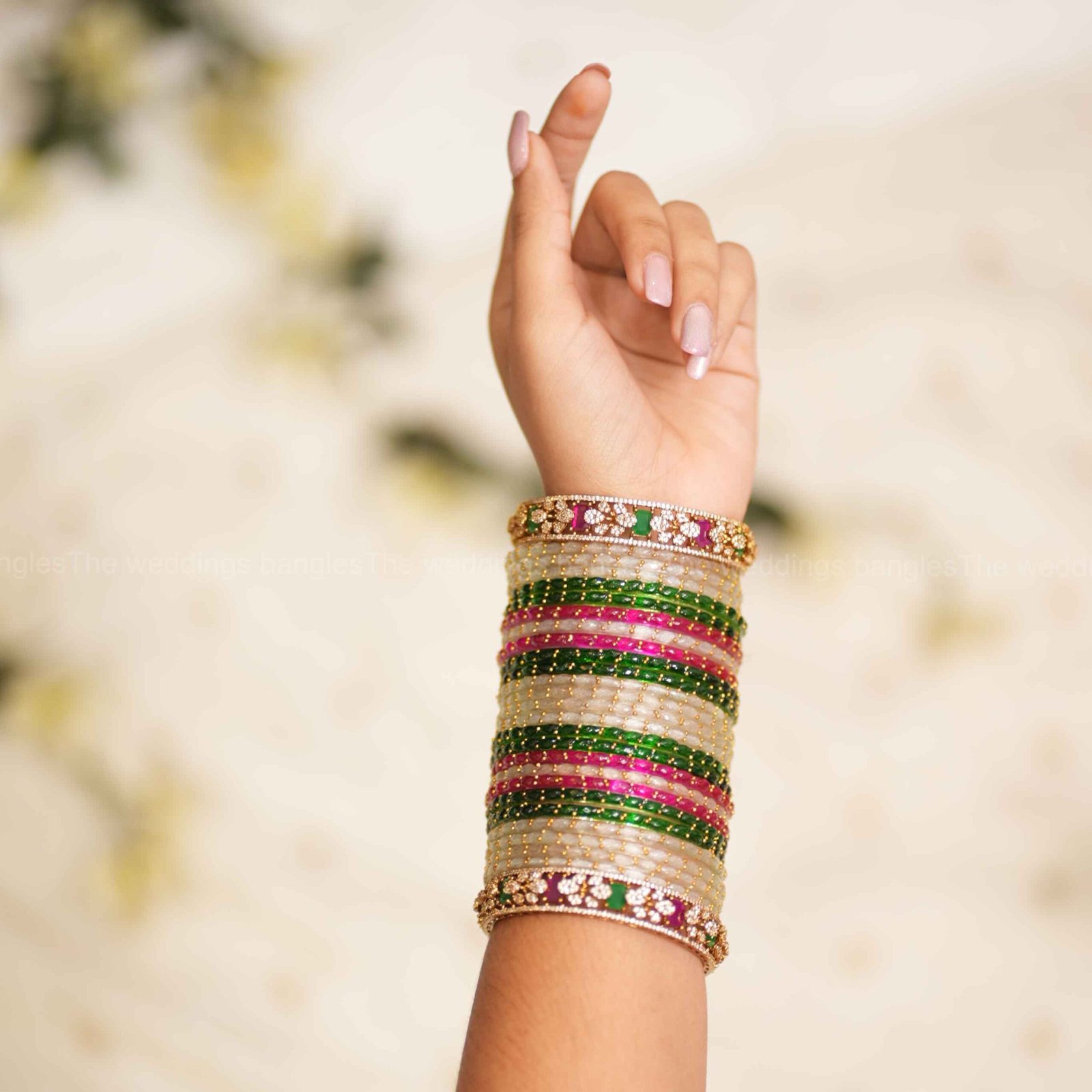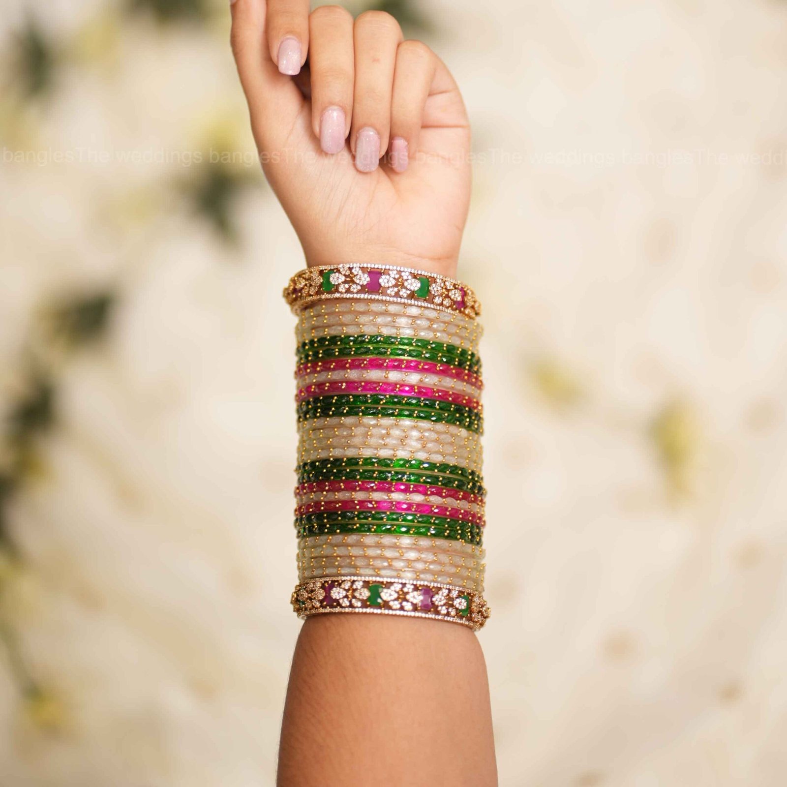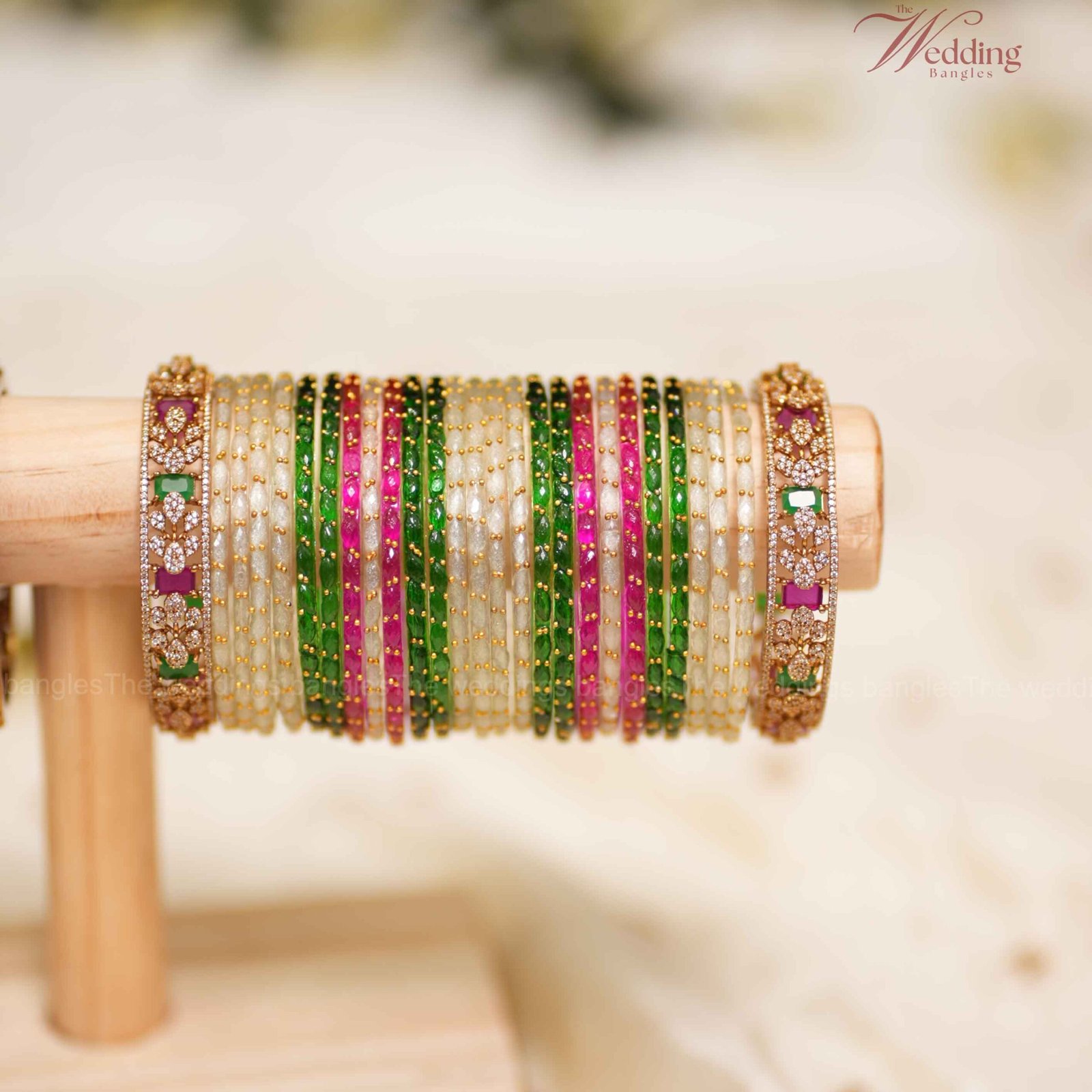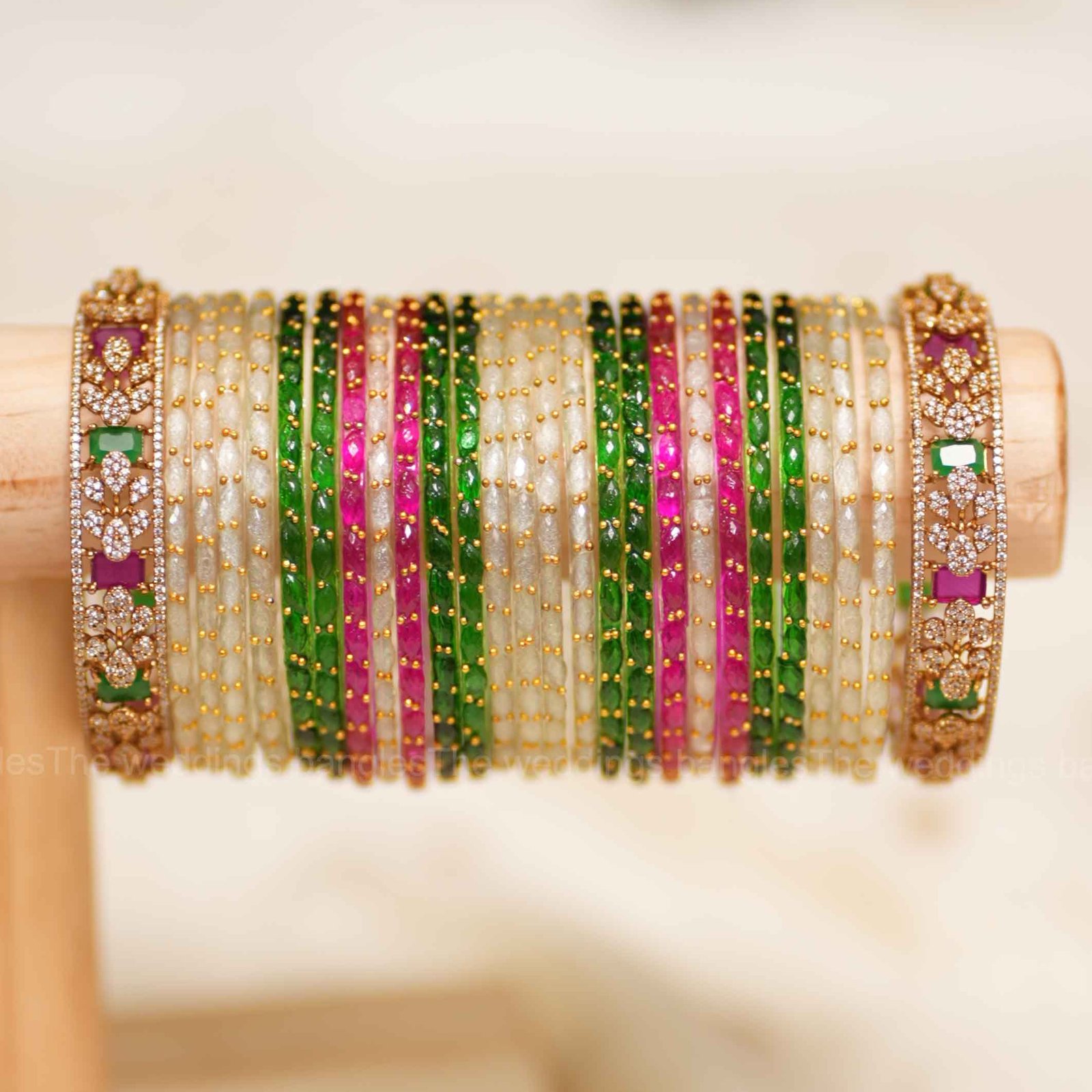 6 dozen glass bangles – Raindrop bangles in ivory, green & ruby pink. - Customization Available.