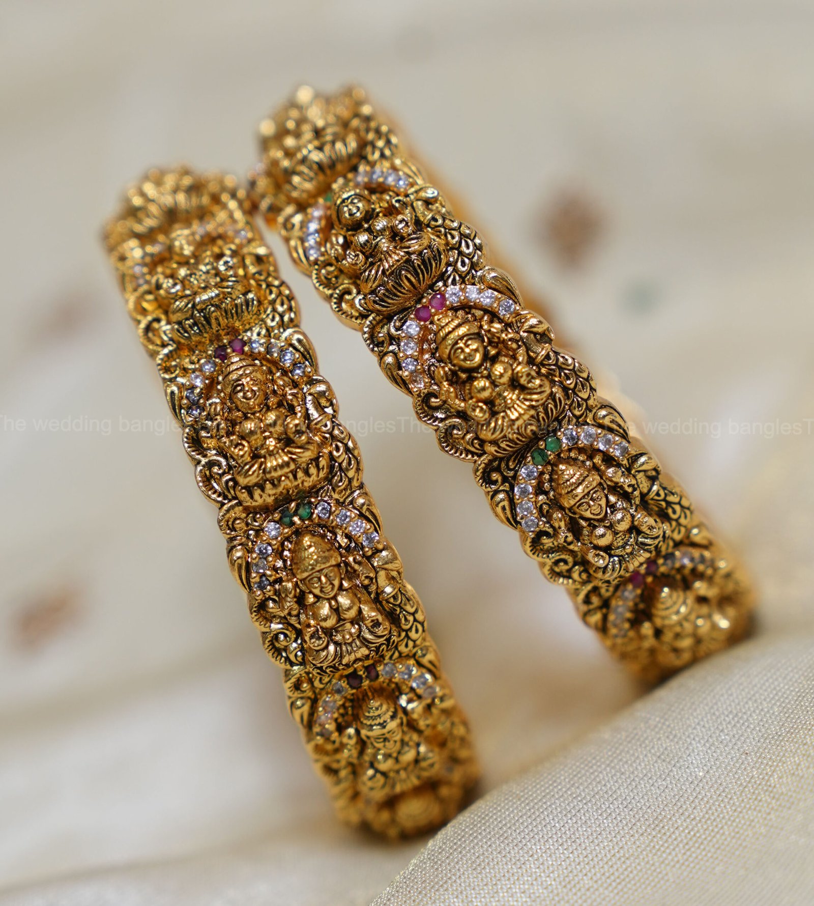 Elevate your traditional ensemble with these temple-style antique gold bangles, intricately crafted with Goddess Lakshmi motifs and detailed embellishments. Each bangle is adorned with divine icons surrounded by shimmering CZ stones and hints of ruby and emerald accents, exuding sacred opulence and heritage charm.