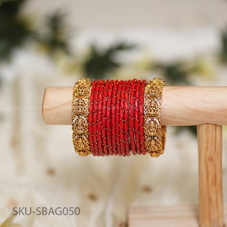 Bring home the essence of tradition with this stunning bangle set featuring intricate Shrikamala antique bangles on the sides, beautifully paired with vibrant red leaf cut glass bangles. A perfect match for festive occasions, bridal wear, or traditional sarees, this set adds a royal charm to your look. Crafted with a fine mix of metal and glass, it balances durability with elegance, making it a timeless addition to your collection.
