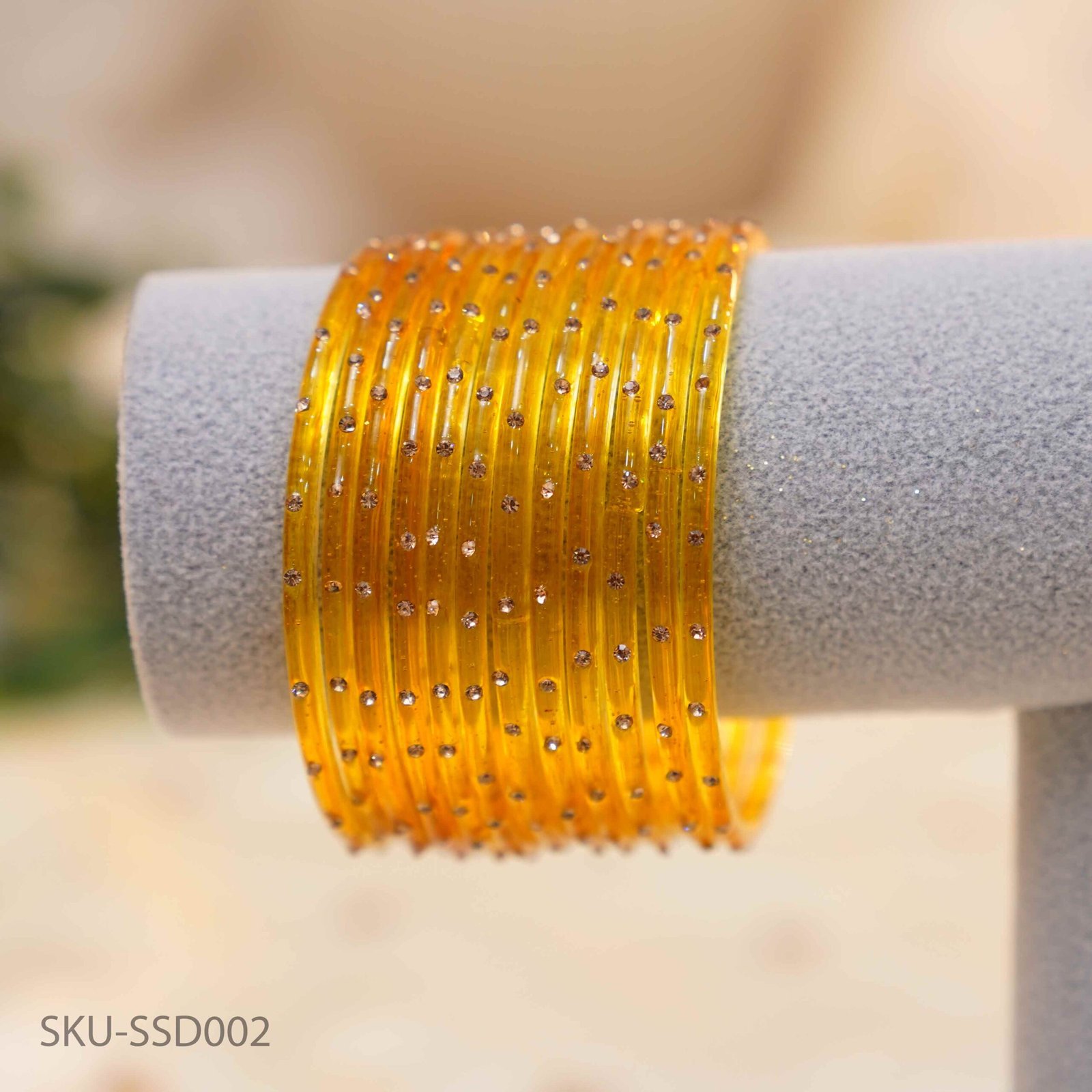 Brighten up your look with these vibrant yellow single stone glass bangles. The golden-yellow hue adds a cheerful charm, while the delicate stone detail gives just the right sparkle. Perfect for festive occasions, traditional outfits, or everyday elegance.