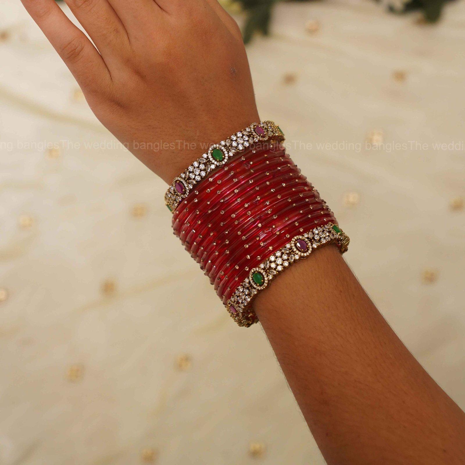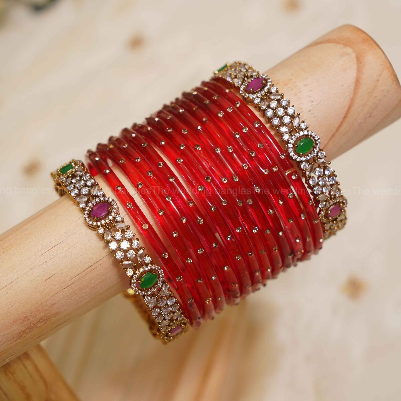 The dazzling combination of bold red glass bangles with gem-studded sparkle kadas makes this set ideal for weddings, receptions, and festive celebrations, ensuring you shine with elegance.
