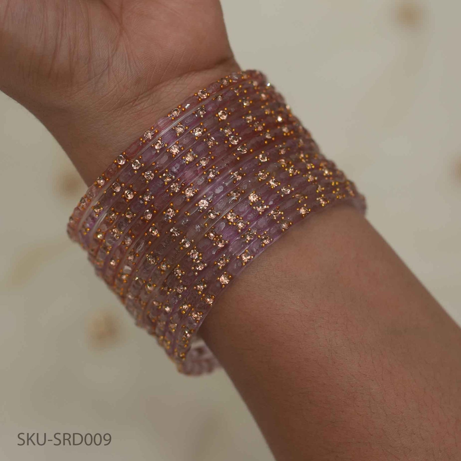 Chic and trendy, these onion pink square raindrop bangles bring a modern twist to traditional wear. Their muted pink tone with sparkle makes them versatile for day-to-night styling.