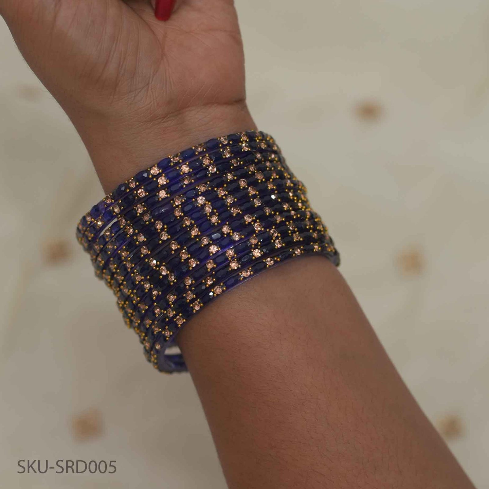 A bold choice for statement styling, these royal blue square raindrop bangles shine beautifully with golden accents. Perfect to pair with sarees, lehengas, or festive gowns.