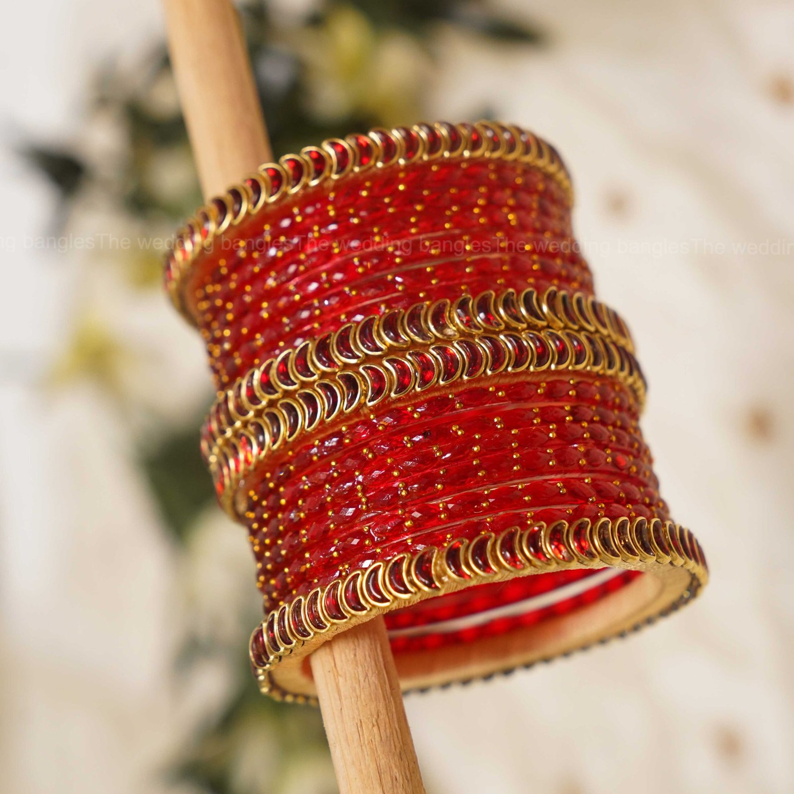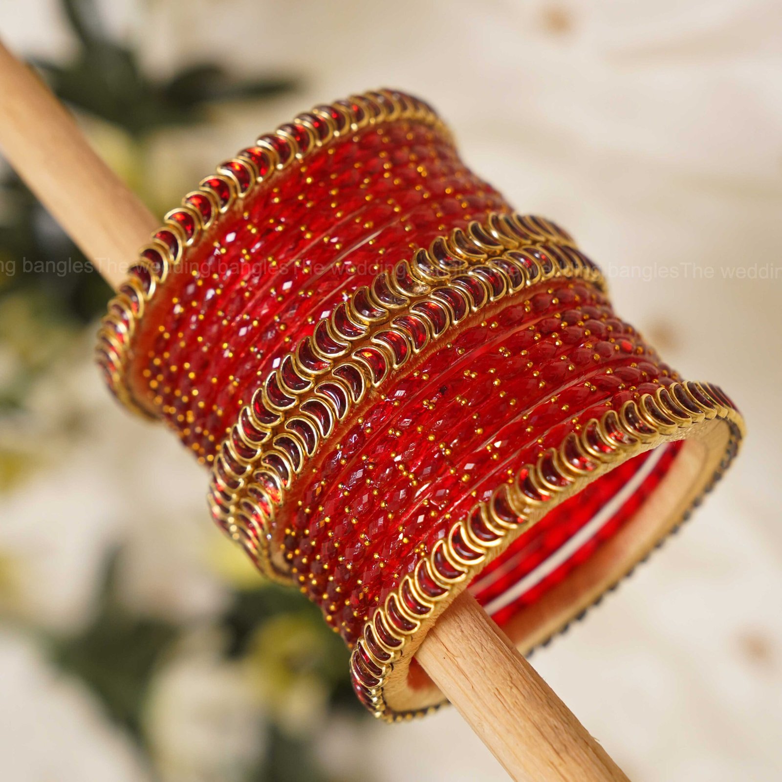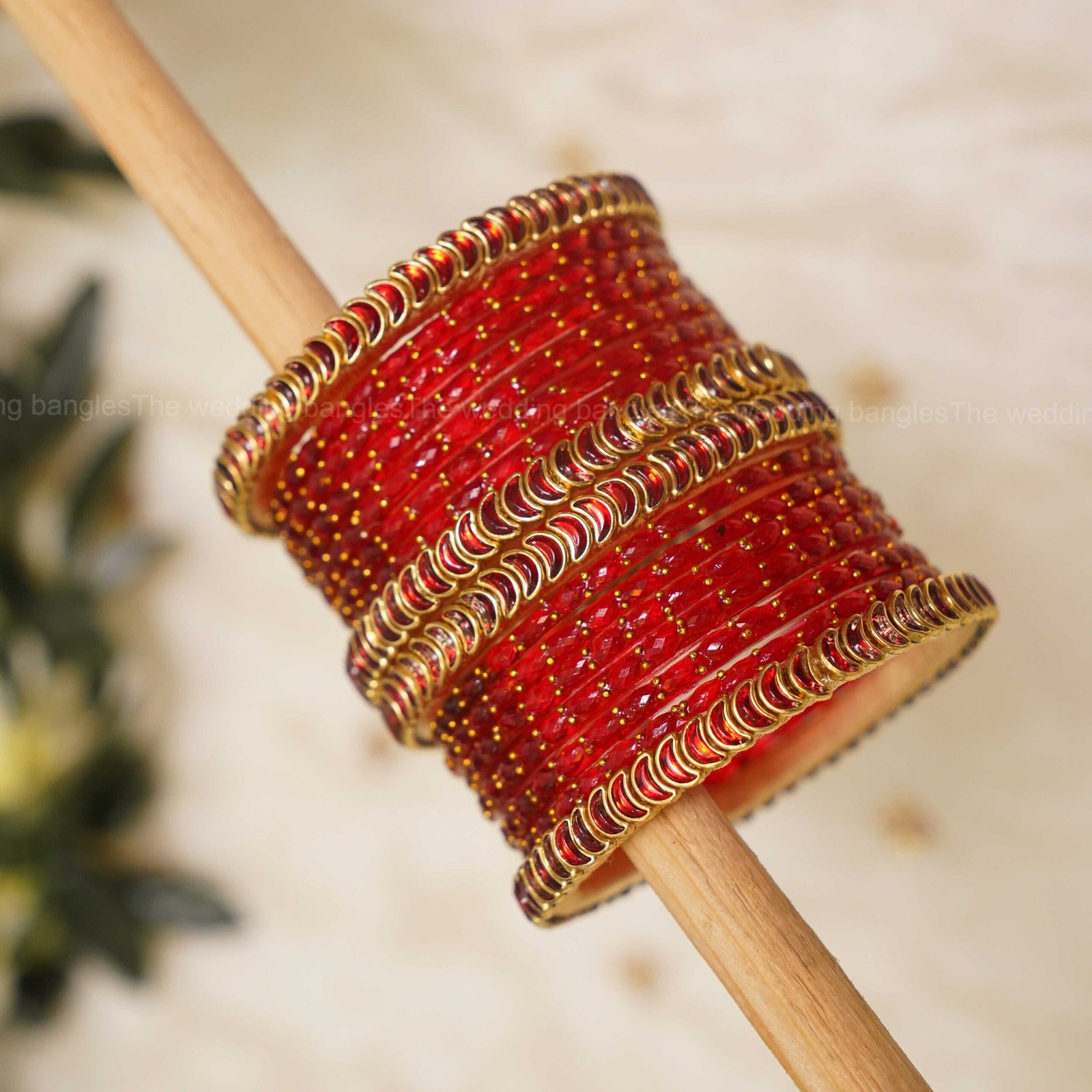 A timeless blend of tradition and radiance! The Scarlet Glow Glass Bangle Set features vibrant red glass bangles adorned with delicate golden bead accents. Paired with beautifully detailed antique-finish side kadas featuring crescent motifs, this set exudes elegance and festive charm. Perfect for weddings, bridal wear, festivals, or any special occasion where you want to shine with grace and grandeur.