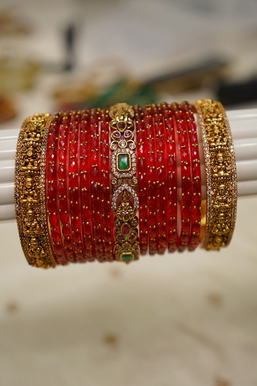 Add a touch of royal allure with our Swarnaratna Lakshmi Red Temple Bangle Set. The set combines Antique Divine Lakshmi Temple Bangles on the sides with a grand Swarnaratna Lakshmi centerpiece, perfectly paired with deep red raindrop glass bangles. A timeless beauty that radiates auspicious energy and festive charm.