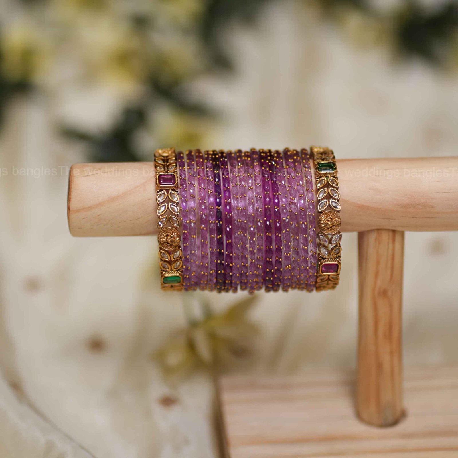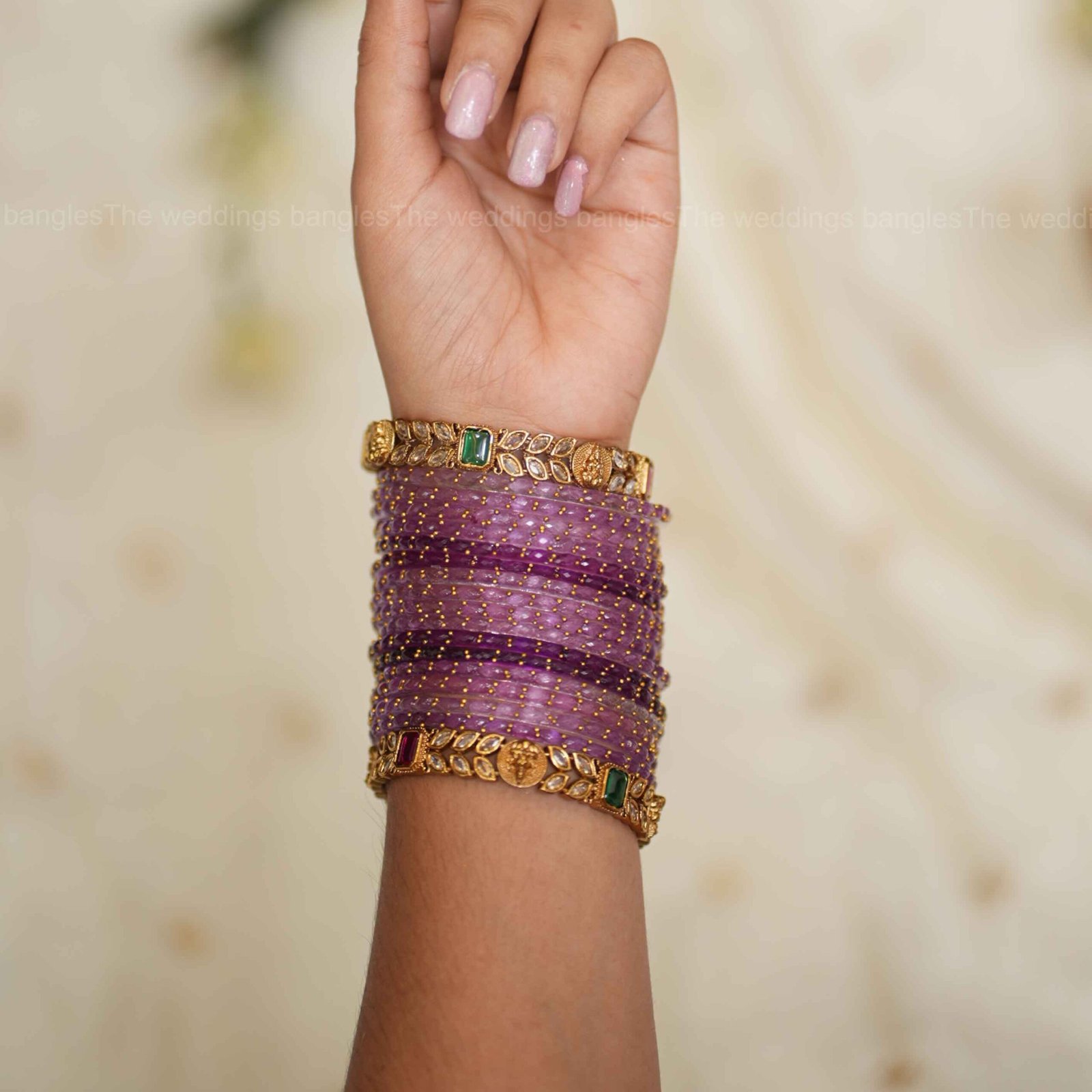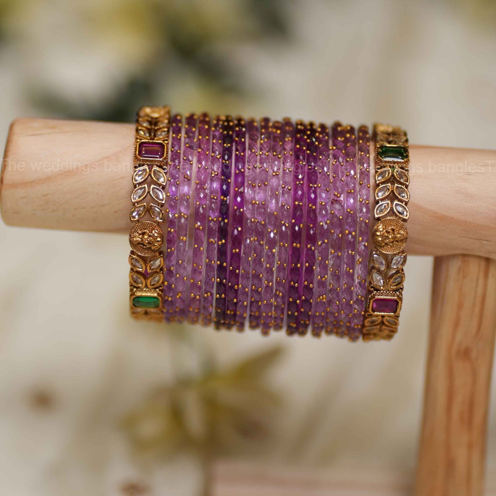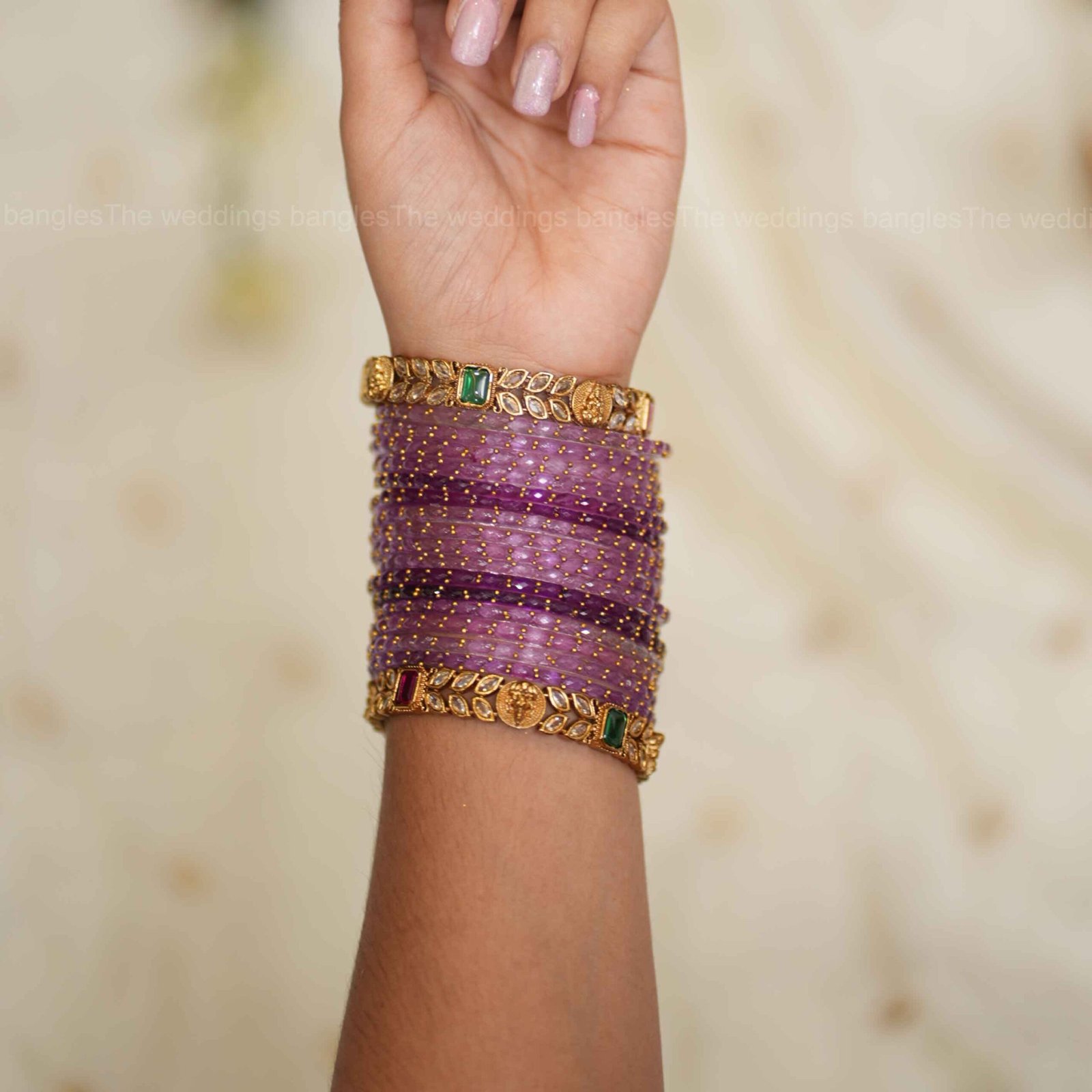 The harmony of delicate lavender tones with ornate leaf kundan kadas makes this set a perfect pick for weddings, receptions, and festive occasions where sophistication meets heritage style.