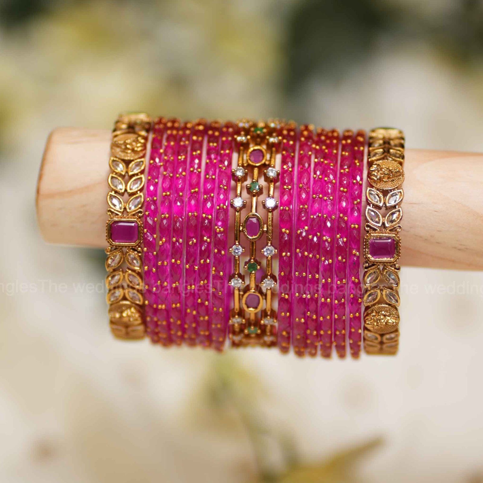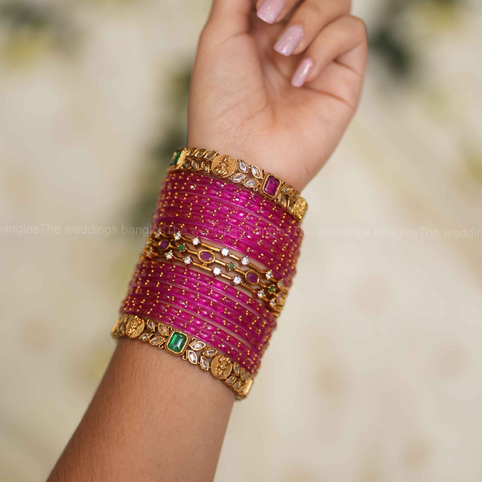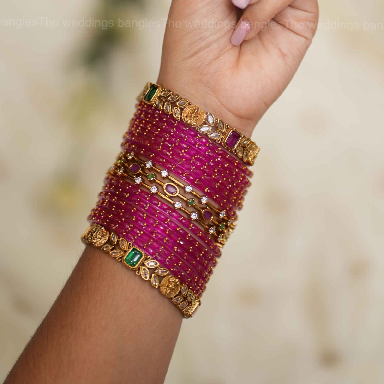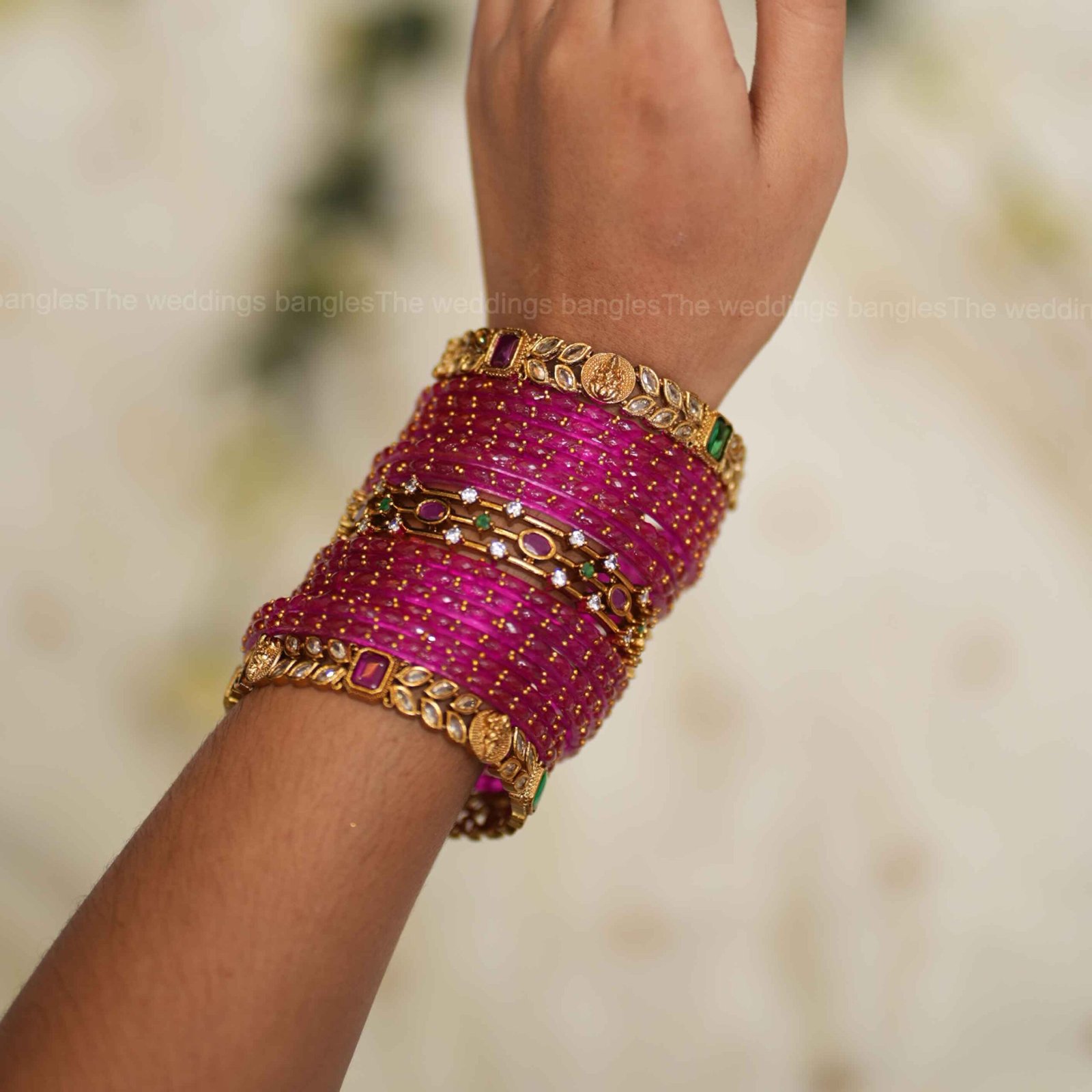 • Middle Bangle: Elegant Gold Bangle with Pink & Green Stone Detailing – a statement piece featuring intricate craftsmanship, highlighted with sparkling pink and green stones for a regal finish.
